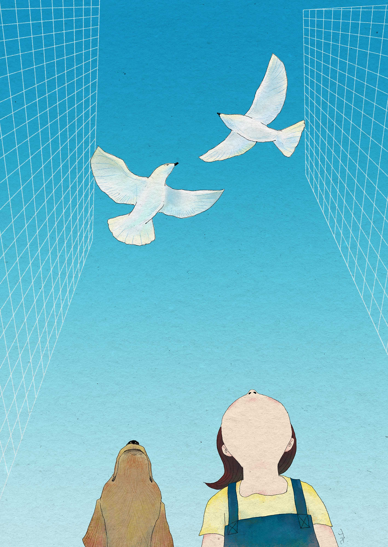 고개를 들어 비둘기의 하얀 배와 파란 하늘이 만나는 어색한 풍경을 마주하며
