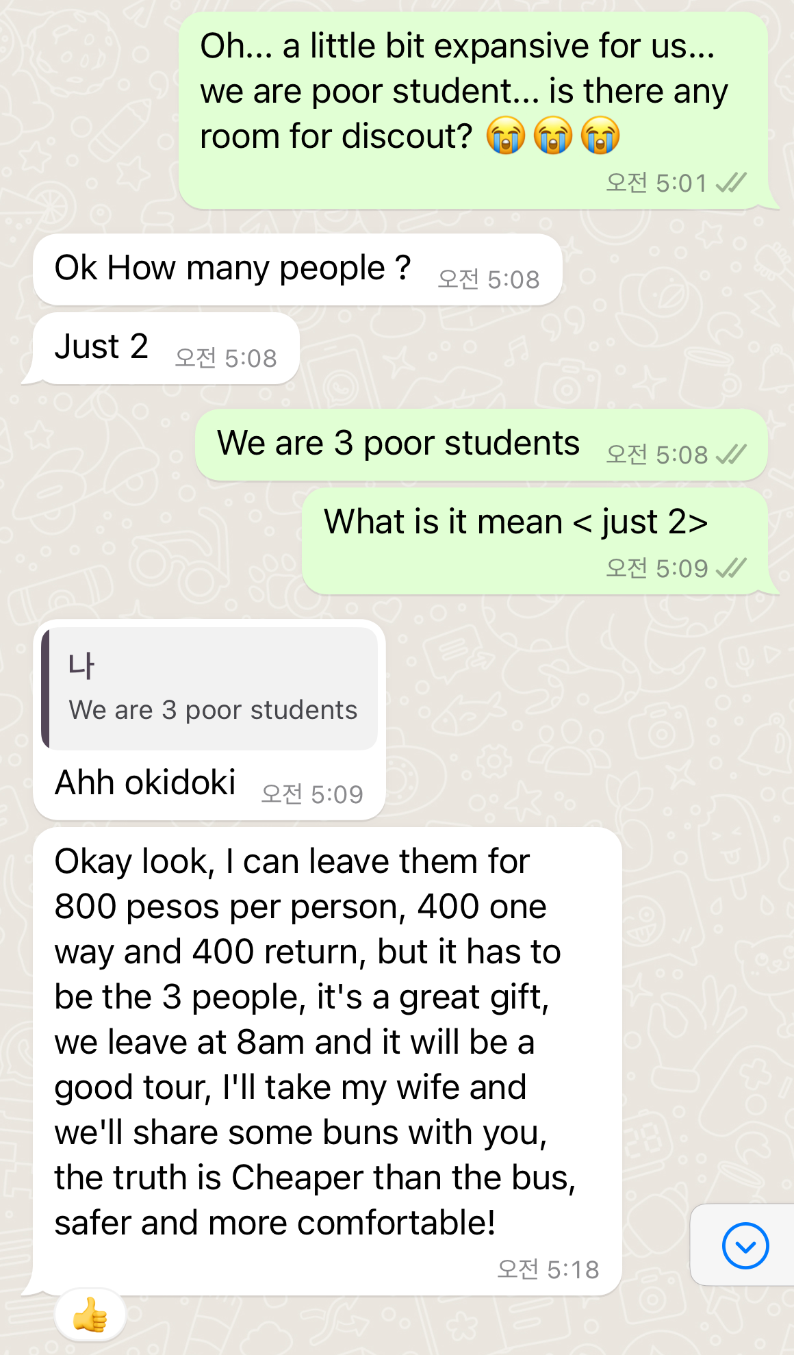 다행히도 이번 여행에서 인복이 넘쳐흘렀던 나는 플라야 델 카르멘에서 숙소쉐어를 같이하던 언니에게서 택시기사를 초대받았고, 택시기사에게 "Estudiante ambre(가난한 학생, 이전화 참고)"이라고 불쌍한 척을 하며 3인당 2,400페소에 세노테 투어를 예약했다. 나는 1인당 1,000페소도 괜찮게 흥정한 것이라고 생각했으나 3인당 2,400페소는 무지 파격적이고 양심적인 금액이었다.