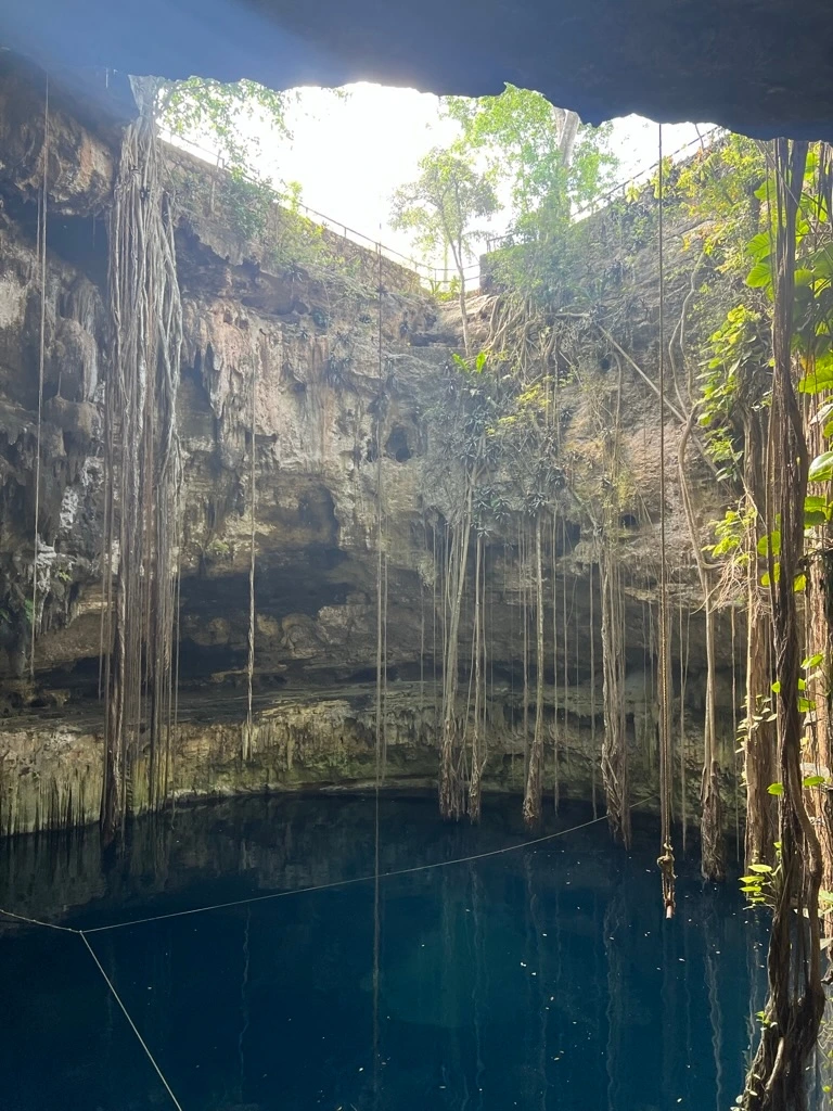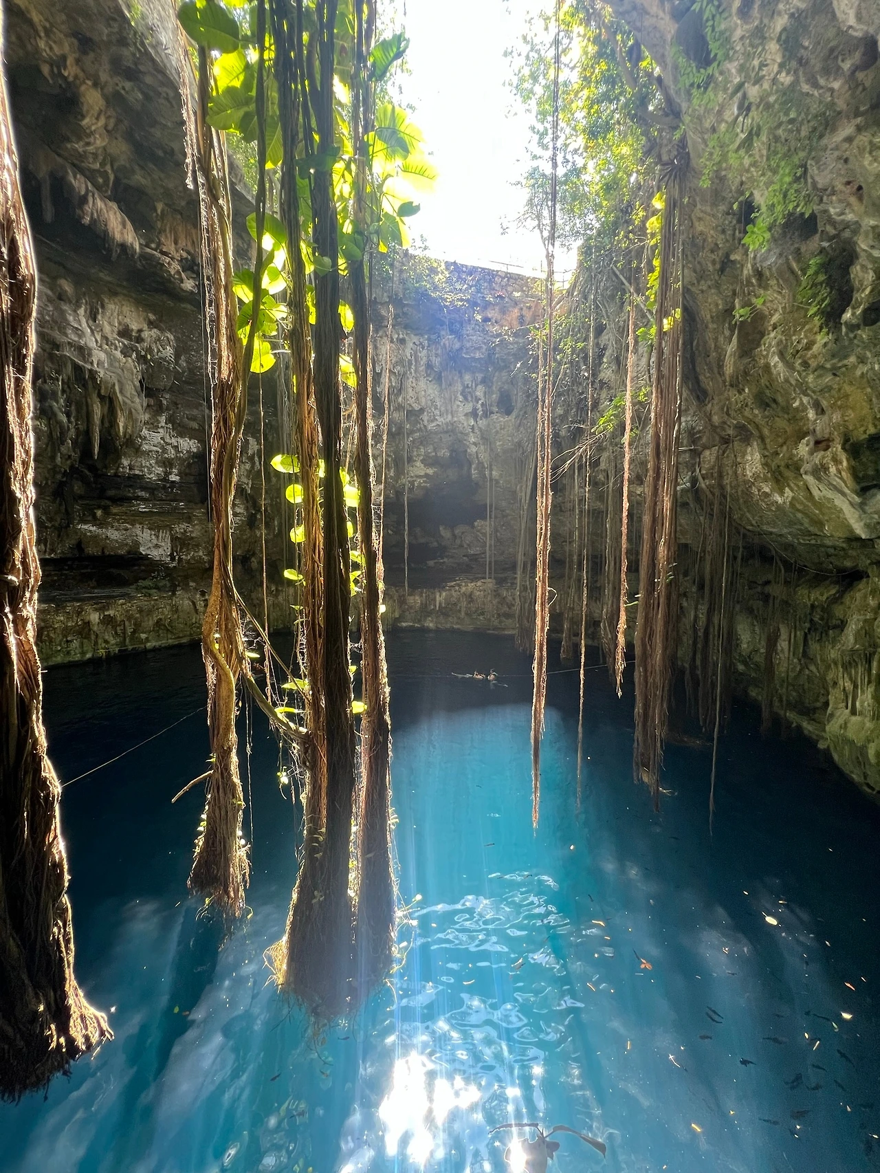 그렇게 계단을 내려가니 인생에서 처음 보는 장관이 펼쳐졌다. 이온음료처럼 파란색 물과 동굴, 주변에 줄처럼 늘어져 있는 덩굴과 동굴 위에서 물로 꽂히는 빛까지. 하나부터 열까지 모든 게 새로웠다.