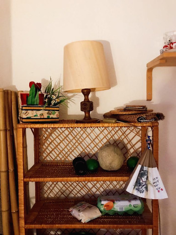 저 램프가 마지막으로 우리가 '그녀'의 집에서 얻어온 것이고, 저 대나무 선반은 다른 여인 (?)으로부터 10유로에 다른 날 구매를 했다. 왼쪽 뒷편에 보이는 대나무 장대들은 길레름의 이전 침대 팔레트의 일부로 침대 구조에 쓰였던 것인데, 다 해체해서 버리면서 괜찮은 대나무들은 어디 쓸때가 있을까해서 남겨두었다. 아직 활용할 거리를 찾지는 못했지만 새로 들인 저 램프와 선반 옆에 놓여있는 것만으로도 나름 그 몫을 하는 듯 보인다.