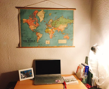 저 세계지도는 주인의 할머니때부터 간직했던 거라고 한다. 7유로에 건졌다. 주인은 막 스무살을 넘기곤 아랍계 미국인이었는데, 다시 미국으로 돌아가기에 집 안의 물건들을 최대한 많이 파는 것이 목적이라했다. 사실, 그녀의 집에 가던 중에 그녀로부터 우리가 사겠다고 한 지도를 더 높은 값에 사겠다고 한 사람이 나타났다는 연락을 받았다. 그러고 그녀는 그가 곧 온다고 했다며, 그를 기다렸다가 지도를 경매에 붙여도 되겠냐고 물었다. 우리는 당황하기도 했고, 기다리고 경매까지 하고서 가져갈 만한 물건은 아니라 생각하여 지도는 고사하고 집안 곳곳 그녀가 내놓은 다른 물건들을 보고있었다. 그렇게 15분이 지났고, 결국 지도에 관심있던 남자는 '사기'로 드러났고, 그녀로부터 고스팅 (유령처럼 사라지는 행각) 해버렸다. 그렇게 우리는 그자리에서 우리의 기존 목표였던 지도를 건져왔다! 뿐만 아니라 우리는 그녀의 집에서 이케아 사진 액자 (1유로)/ 원목 안틱 램프(9유로)/ 장식용 LED 로맨틱 광선 (3유로) (? - lightning cable) 을 건져왔다.