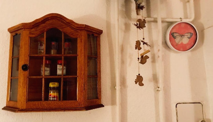 이 찻잔은 반년도 전에 마우어파크의 벼룩시장에서 15유로 (나름 비싸다!)를 주고 사놓고는 좁은 집에 어디 마땅한 자리를 못 찾고 그저 방치해두었었다. 사실은 누가 같은 값에 사려고하면 팔려고 내두었는데, 지난 주말에 이웃 커플이 와서 뚝딱뚝딱 설치를 해주어서 이제 우리 주방 한 공간에 예쁘게 걸려있다. 무거운 것들을 넣으면 무리가 될 것 같아 간단한 소스들 - 일상에서 매일 쓰지 않는 스파이스 (양념) 들을 넣었다. 자랑스러운 우리의 한국산 깨소금도 함께 하하