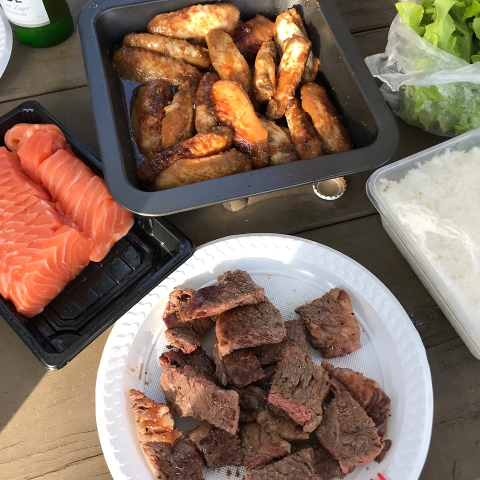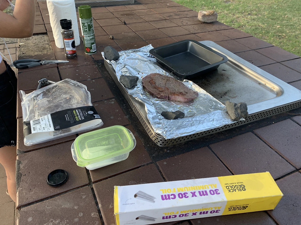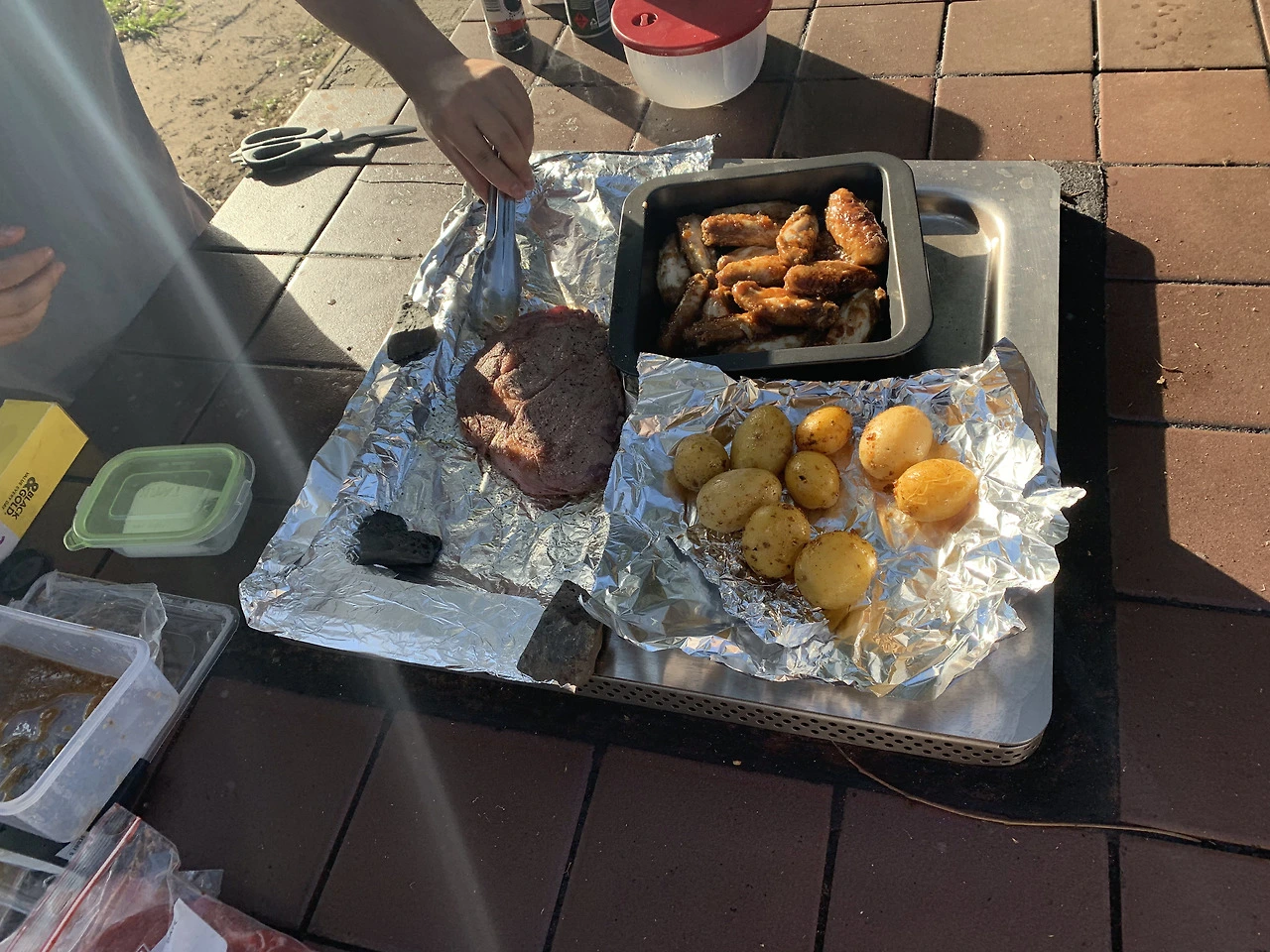 우리는 빠르게 음식 준비를 시작했다. 불판을 깨끗이 닦고 쓰기에는 그만한 양의 물과 세제를 들고 오기는 힘들어서, 그냥 불판 위에 은박지를 깔고 그 위에 재료들을 굽기로 하였다.