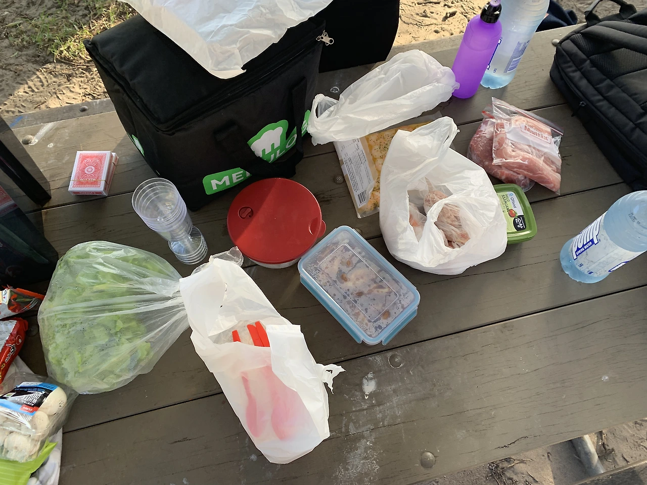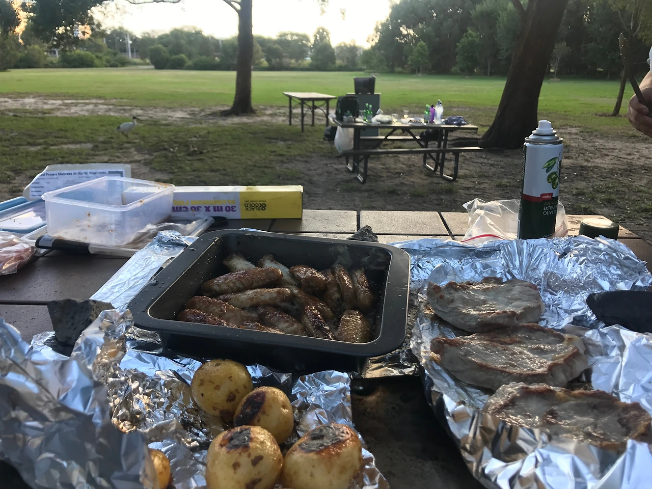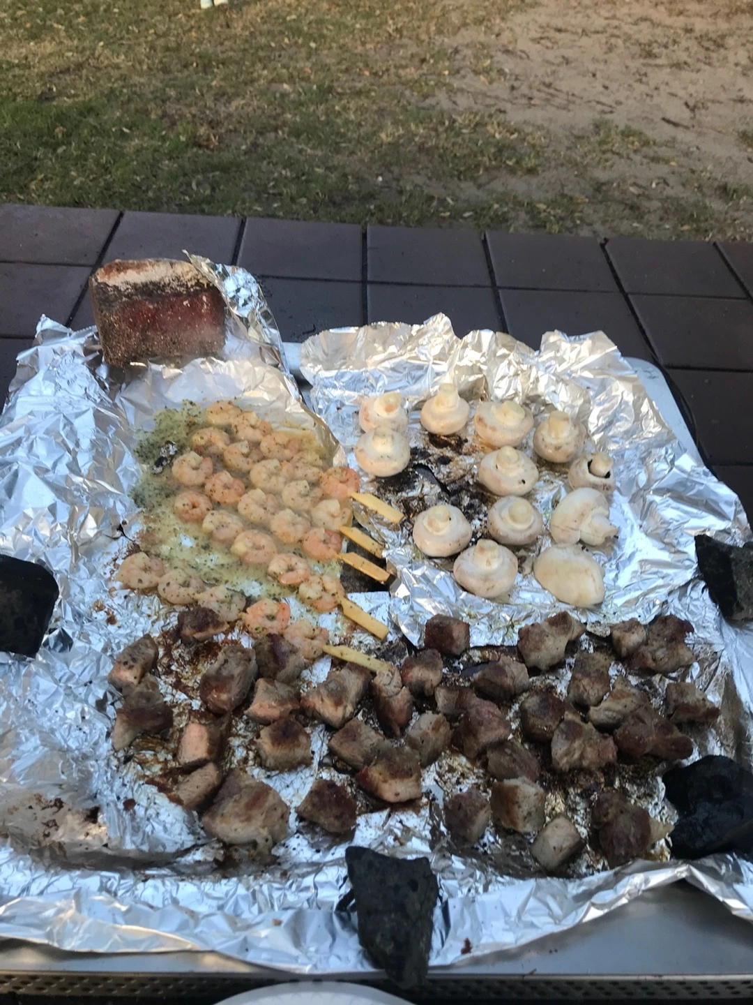 우리는 빠르게 음식 준비를 시작했다. 불판을 깨끗이 닦고 쓰기에는 그만한 양의 물과 세제를 들고 오기는 힘들어서, 그냥 불판 위에 은박지를 깔고 그 위에 재료들을 굽기로 하였다.