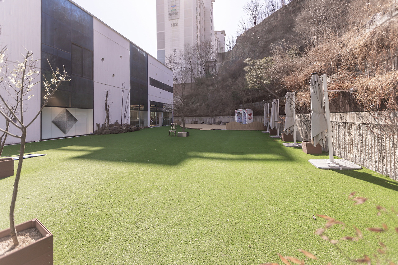 또한 넓은 주차 공간 이외에도 카페 야외에 넓은 인조잔디가 깔려 있어 아이들이