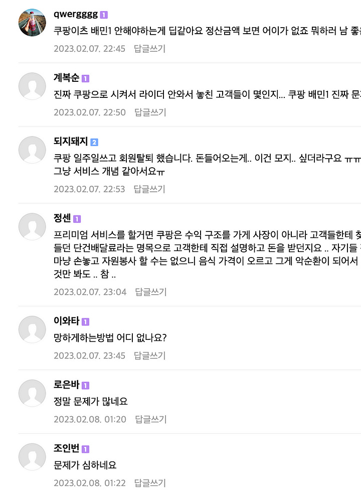 그 외에도 자영업자들이 활동하는 수많은 게시글의 댓글만 봐도, 배달의 민족이나 쿠팡이츠를 욕하는 글들이 만연합니다. 무엇이 평범한 그들을 이토록 분노하게 했을까요?