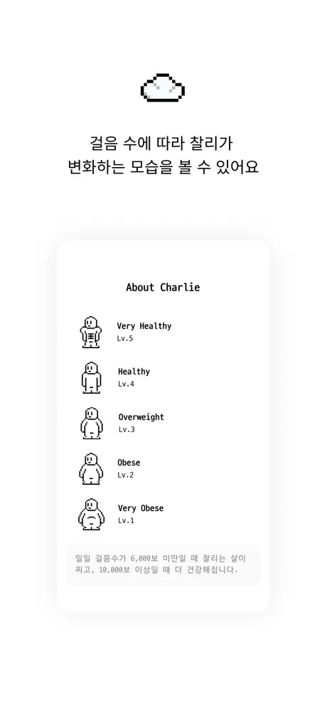 찰리와 걷기에서는 하루 걷기 6,000보를 기준으로 해서 직장인들 기준 성취가 너무 어렵지도 않지만, 조금은 노력해야 하는 정도로 설정되었다. 별도의 퀘스트나 임무가 있는 건 아니지만, 일일 6,000보 이상 달성하는 것 자체가 하나의 도전인 시스템이다.