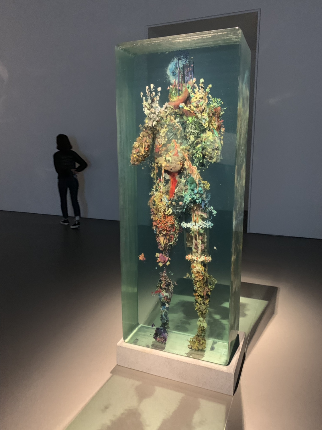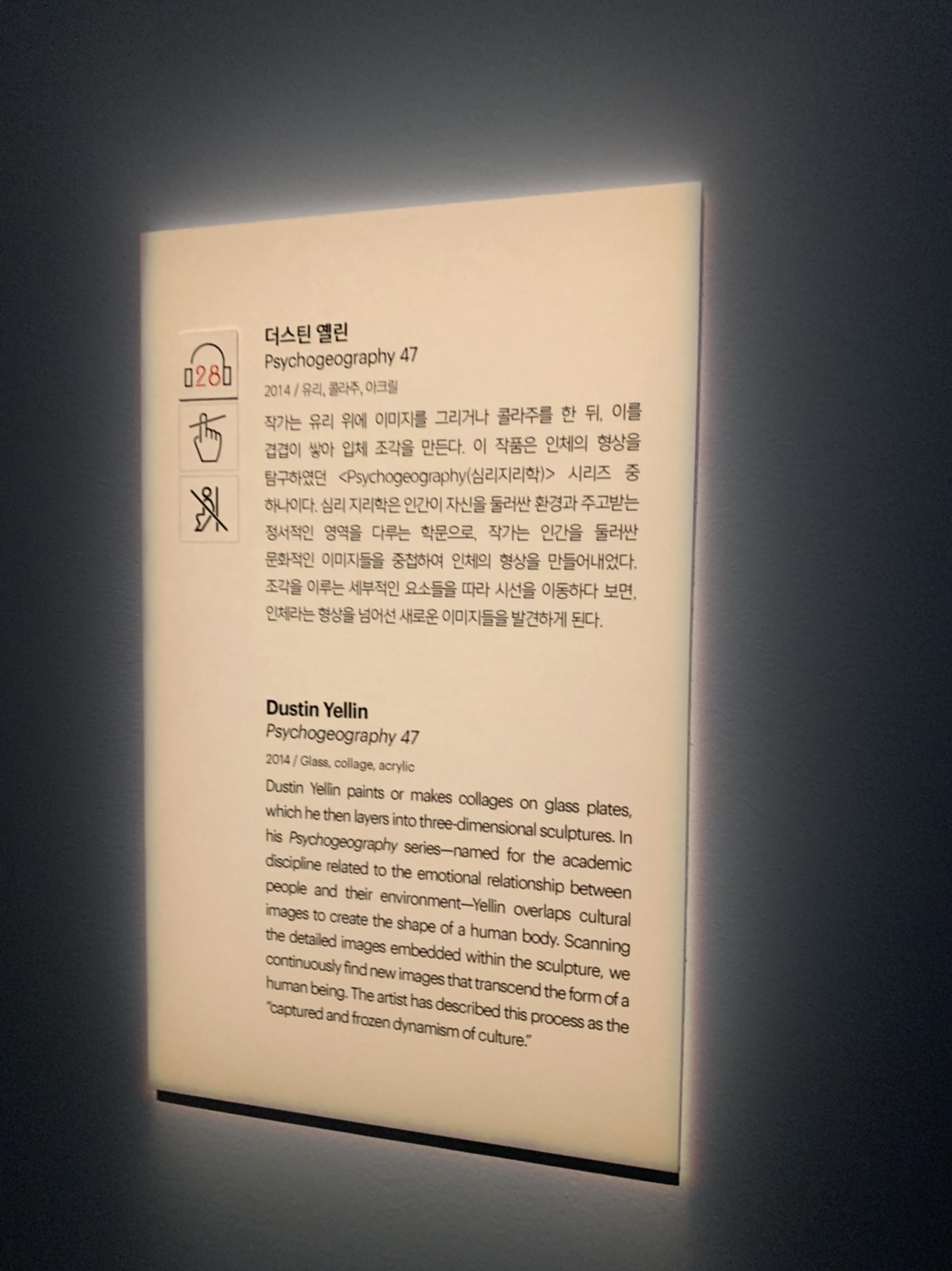 작품의 옆모습 사진을 찍지 못해 좀 아쉬운데, 옆에서 보면 얇은 유리판에 아주 조그마한 물품 내지 사진들이 조각조각 들어있다. 그 유리판들이 합쳐서 지금 저렇게 정면에서 보면 한 사람이 보이는데 한 인간을 구성하고 있는 수많은 요소들을 시각적으로 잘 풀어놓은 것 같아 매우 마음에 들었던 작품이다.