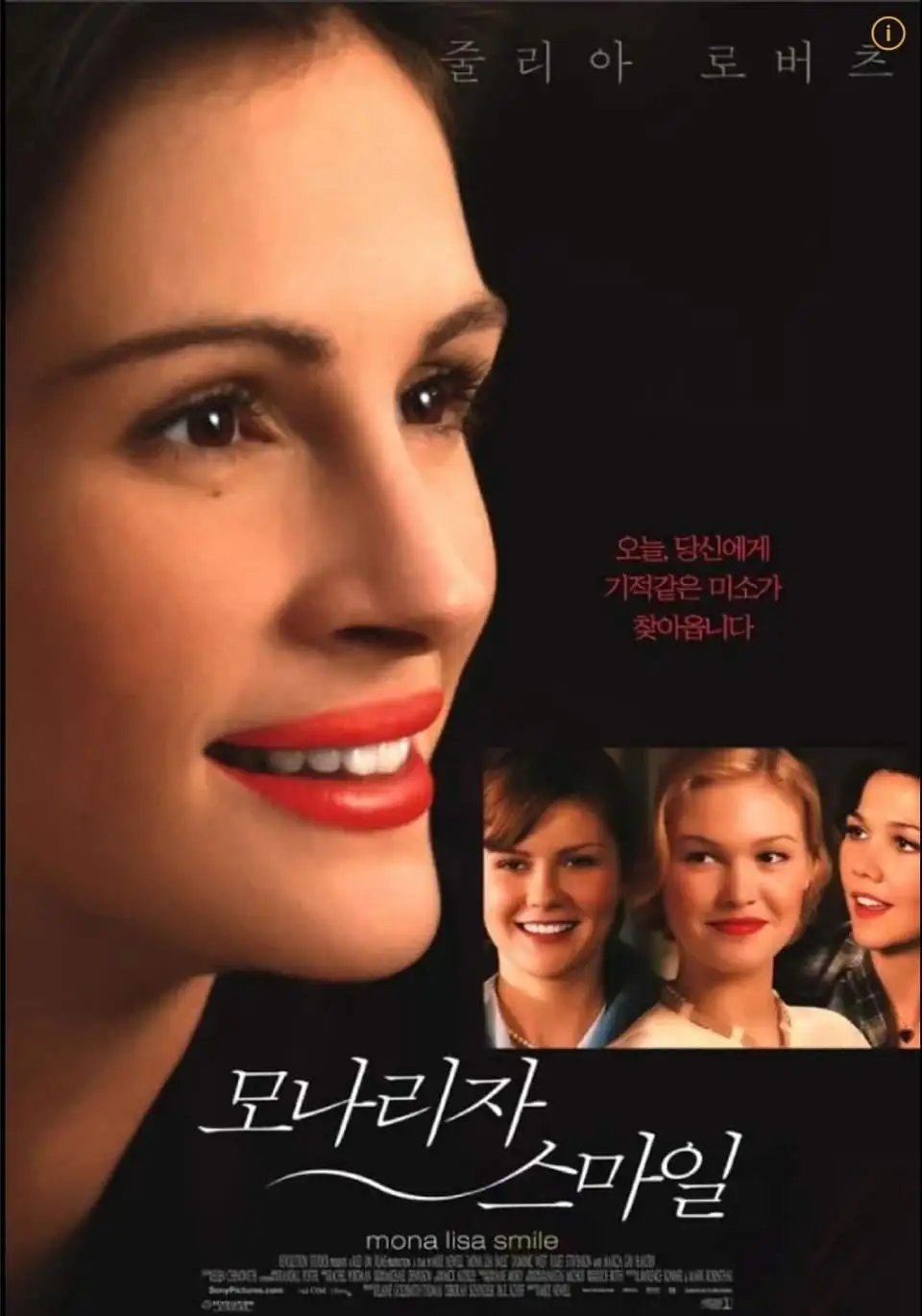 오늘 아침 해장 영화는 "모나리자 스마일" (Mona Lisa Smile)이야. 주연은 줄리아 로버츠로, 그녀가 예술사를 가르치는 자유로운 정신을 가진 선생으로 등장해. 배경은 1950년대 미국의 명문 여자 대학이고, 그녀는 고전적인 성 역할에 순응하라는 압박을 받는 학생들에게 새로운 시각을 제공하며 변화를 이끌어내는 이야기가 중심이 돼.