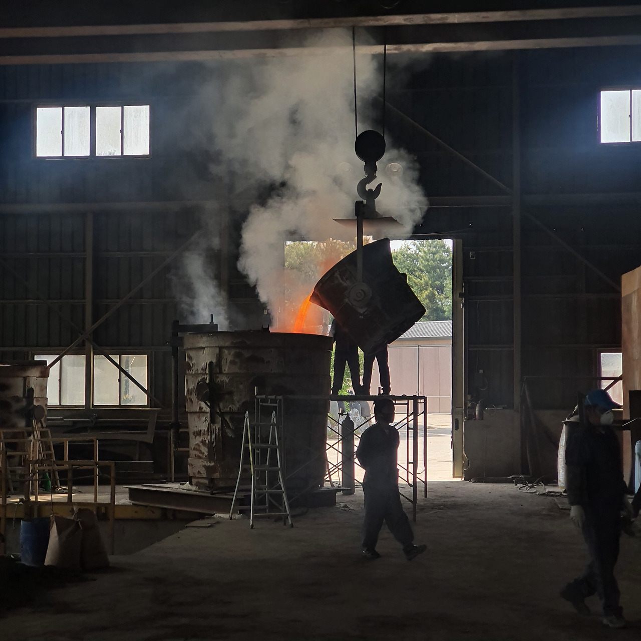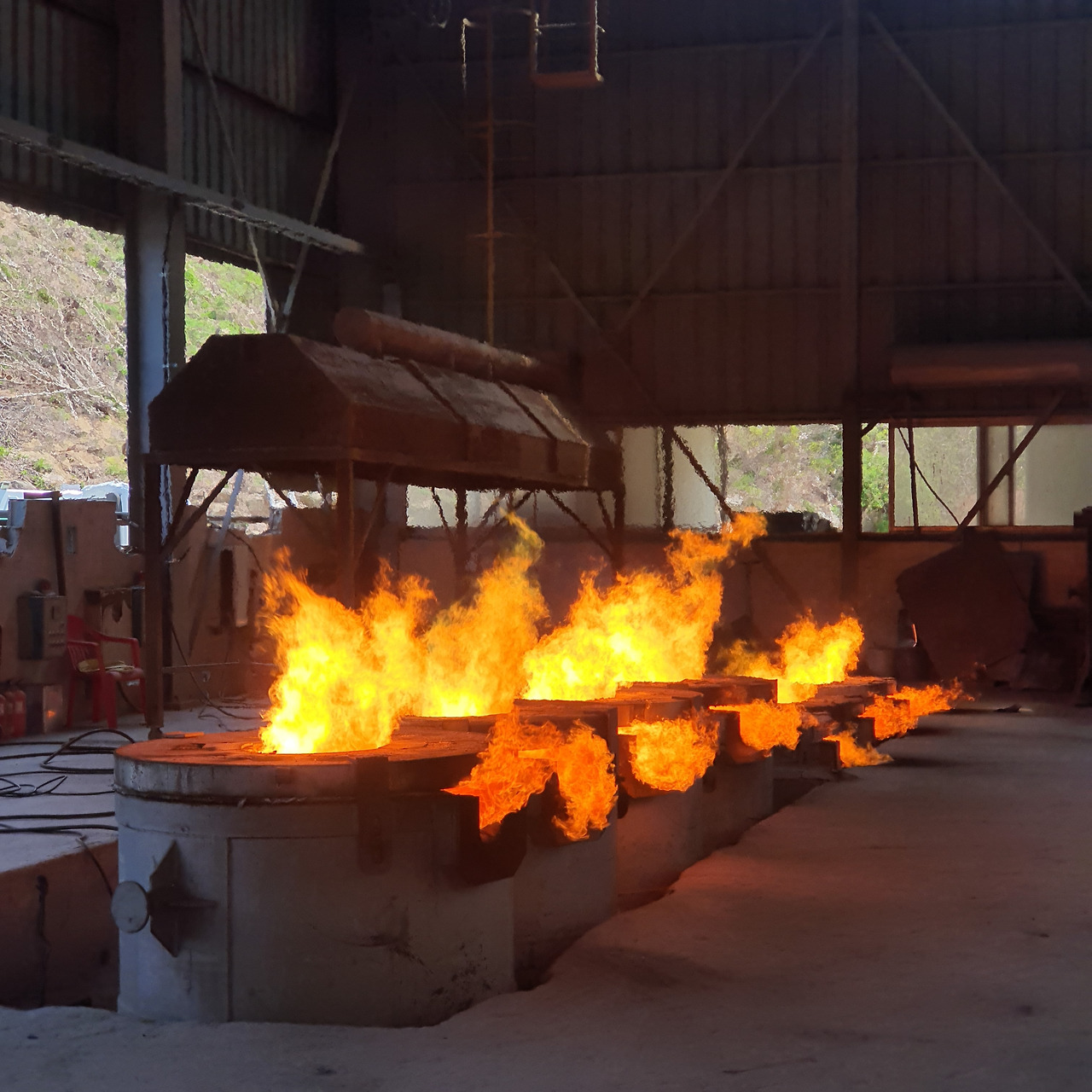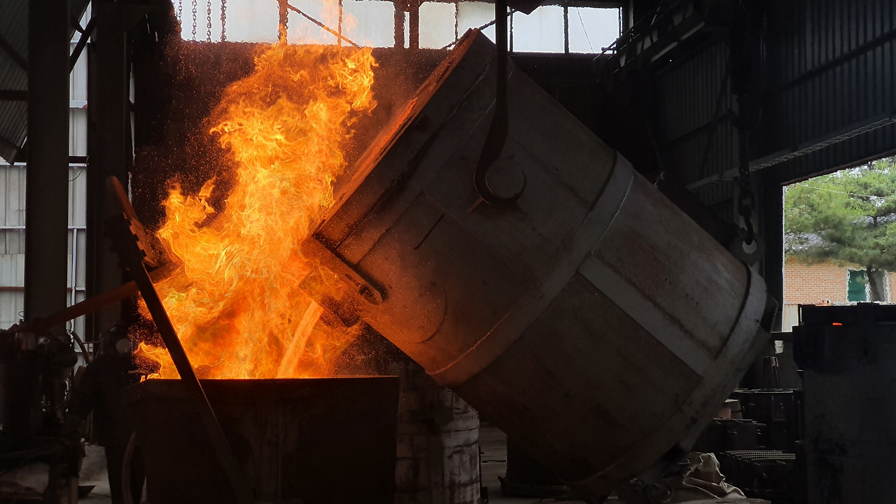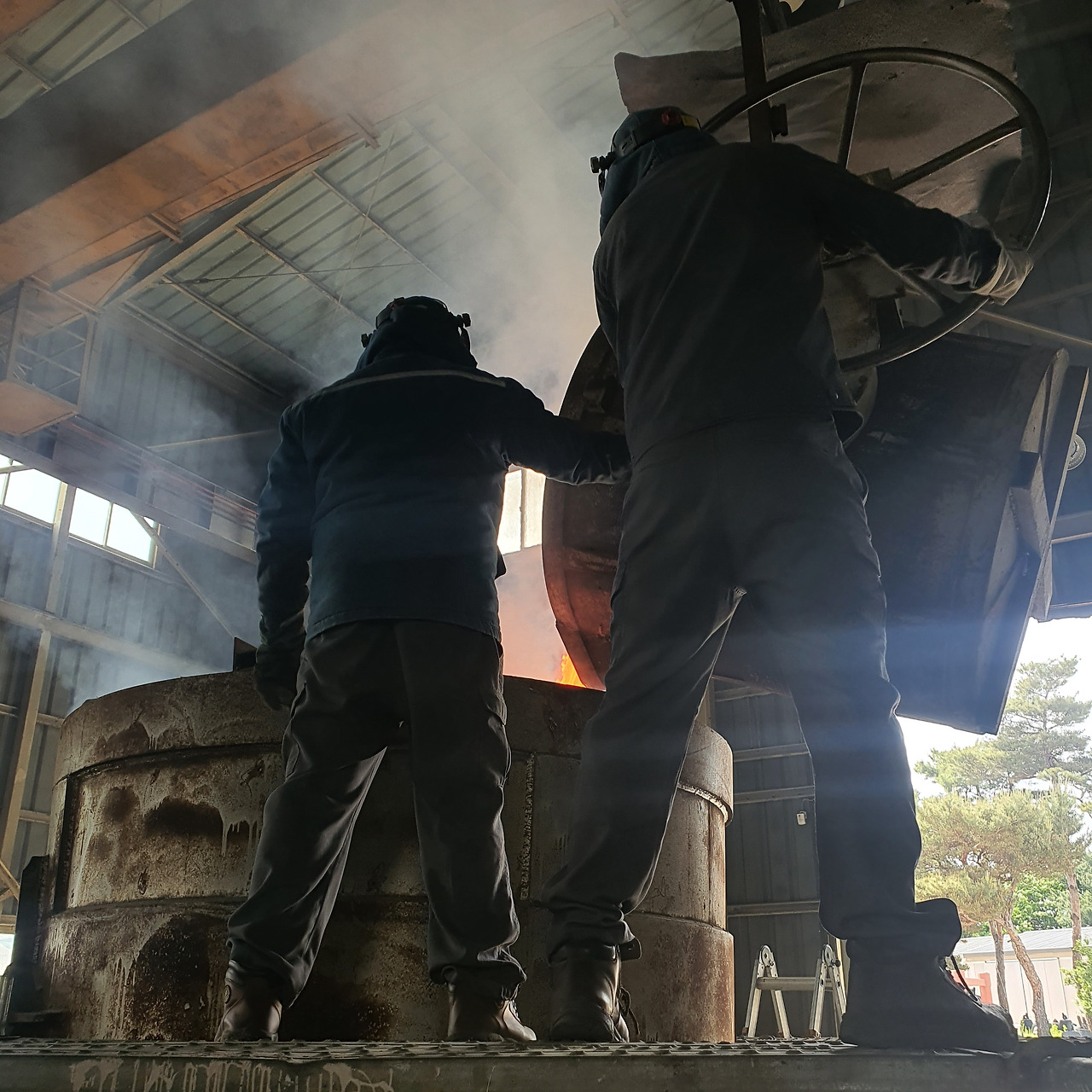 첫 작업은 용해로에 쇠를 녹이는 작업으로 시작한다. 1,000도가 넘는 온도, 가까이 다가가기 힘들 정도의 불길이 치솟는다. 어느 정도 쇳물이 녹으면 위에 뜬 불순물을 걸러내 순수한 쇳물에 가깝게 한다.