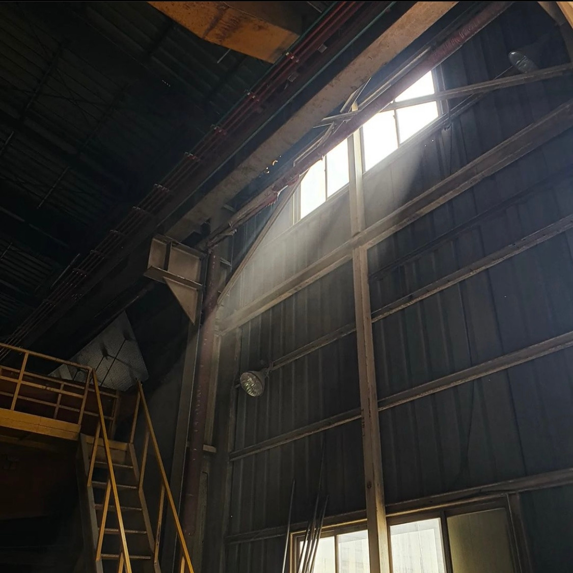 2. 어두운 공장으로 스미는 햇살과 그 햇살에 비치는 먼지