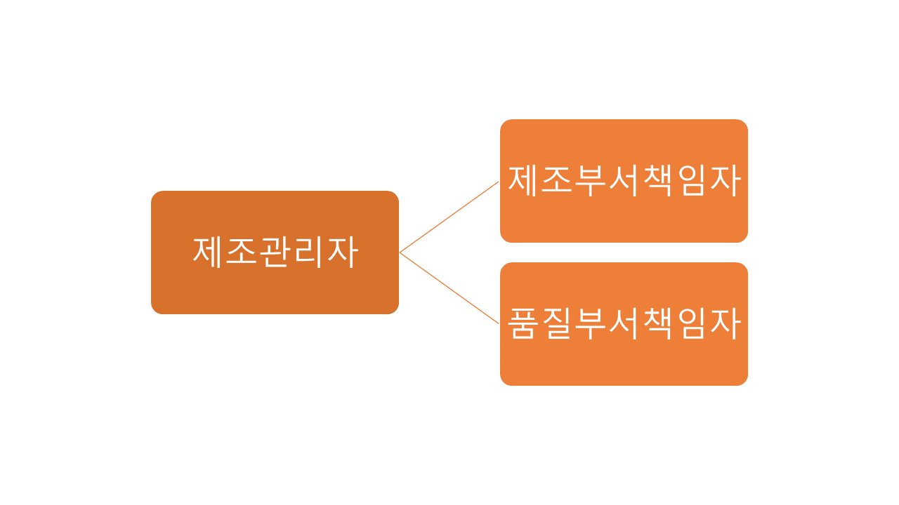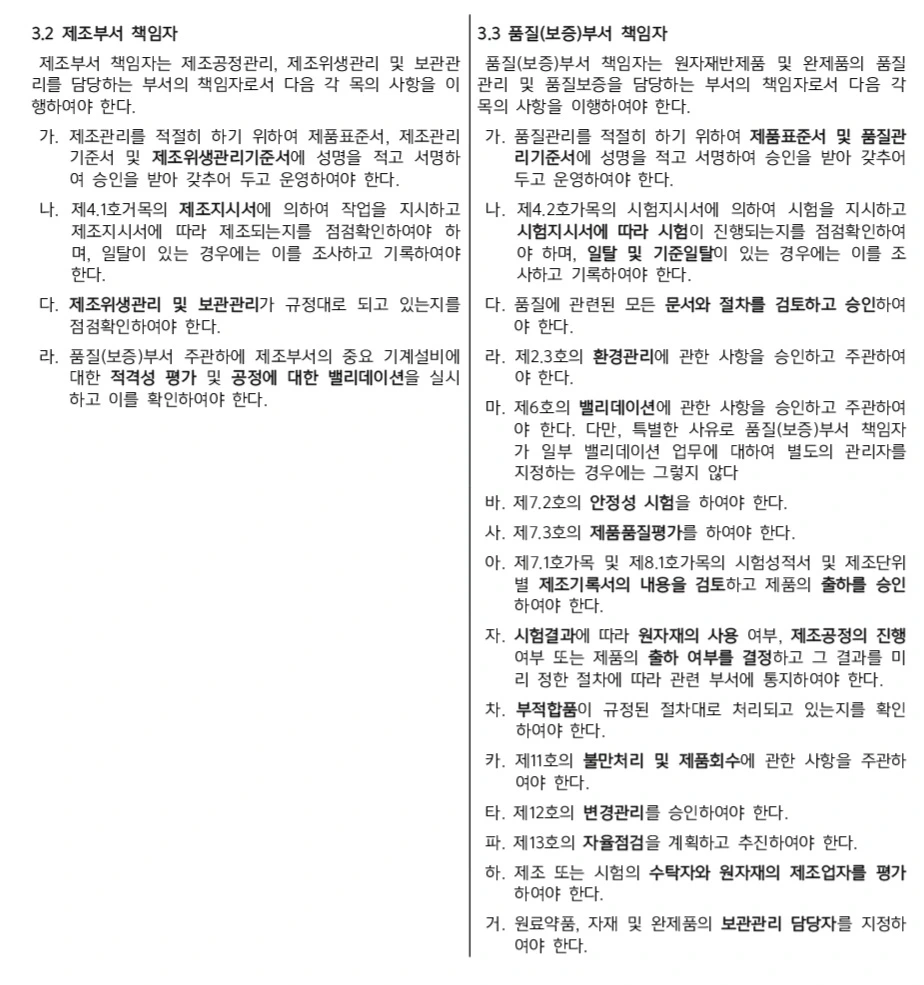 총리령 별표1에서 정한 제조부서책임자(줄여서 '제책')와 품질부서책임자(줄여서 '품책')의 역할. 정해진 역할 갯수로만 봐서는 품책한테 월급 두 배 줘야 된다.