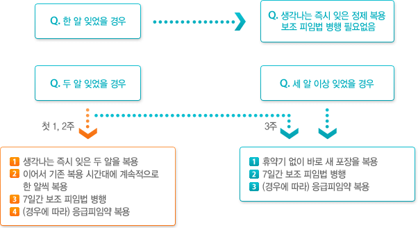 만약 복용을 깜빡했다면 생각나는 즉시 한 알을 복용하면 효과를 지속할 수 있단다. 그런데 12시간이 넘어버린 후라면 다음 번 복용할 때 2알을 복용하면 돼. (기준은 12시간!) 만약 이틀을 연속으로 잊었다면? 그 다음날까지도 2알 복용하고 이후부터 1알을 복용하면 된단다.