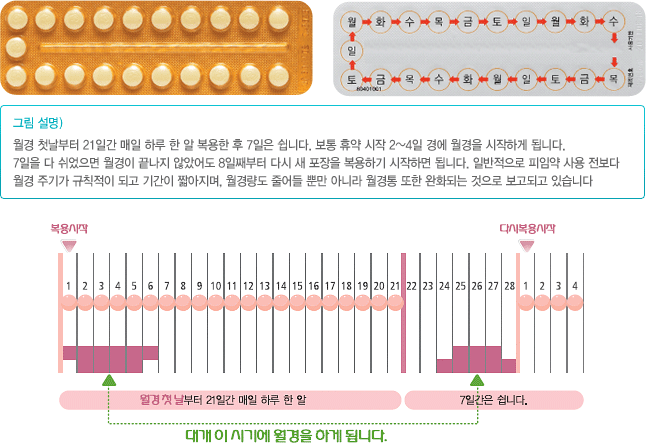 피임 목적이라면, 생리 첫날부터 21일간 매일 하루 한 알 복용한 후 7일간 쉬는 방법으로 복용한단다. (출처=대한산부인과의사회와 함께하는 피임·생리 이야기)