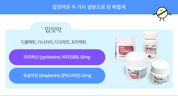 대표적인 입덧약으로는 ‘독실아민’과 ‘피리독신'을 각각 10mg씩 함유한 복합제가 사용되고 있어. 독실아민은 H1 수용체를 차단하는 항히스타민 역할을 하는 성분인데, ‘진정작용’, 즉, 졸음이 오고 정신을 나른하게 하는 효과가 있고, 구역과 구토 같은 증상을 개선해 준단다. 또 피리독신은 비타민 B6의 일종인데 임신 중 구토와 메스꺼움에 효과가 있는 것으로 알려져 있어. 입덧약은 약국에서 그냥 살 수 있는 일반의약품이 아니라 전문의약품이니까, 주치의와 상의해 처방받아야만 사용할 수 있지.