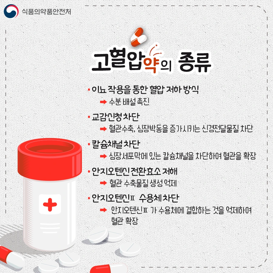 우리 몸의 혈압 조절 방식을 이용해 고혈압약이 개발됐지. 다양한 타겟을 대상으로 약이 나와 있어. (출처=식약처)