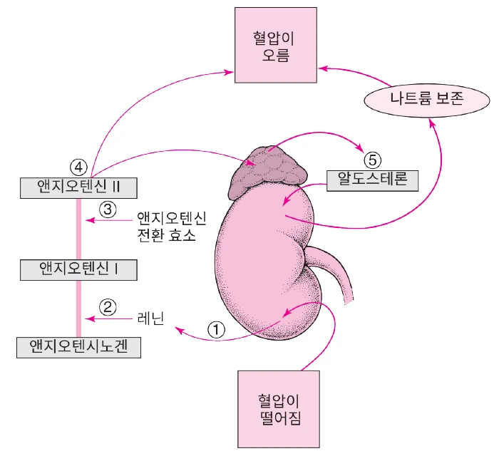 혈압을 높이는 '안지오텐신'은 신장에서 나오는 '레닌'에 의해 활성화되는데, 강하게 혈관을 수축한단다. 여기에 착안한 고혈압약이 ACE 억제제야 (출처=MSD 매뉴얼)
