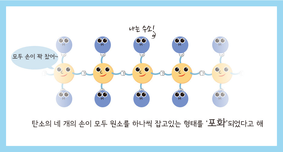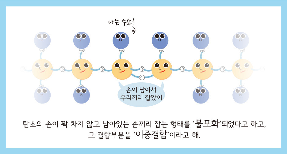 탄소가 수소 두개랑 손을 잡을 수도 있고, 수소 대신 두 손을 맞잡는 경우도 있어. (출처=식품의약품안전처 식약아리아)