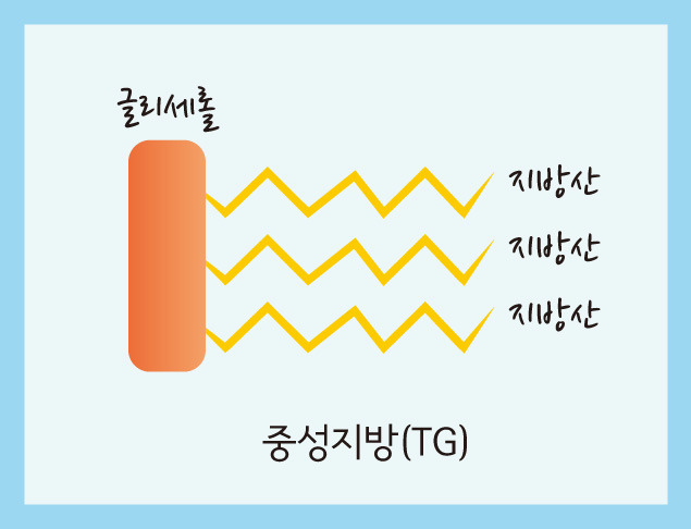 보통 '지방'이라고 하면 중성지방을 말하는데, 이 중성지방은 글리세롤 하나에 길다란 지방산 세 개가 붙은 해파리 모양을 생각하면 돼. (출처=식품의약품안전처 식약아리아)