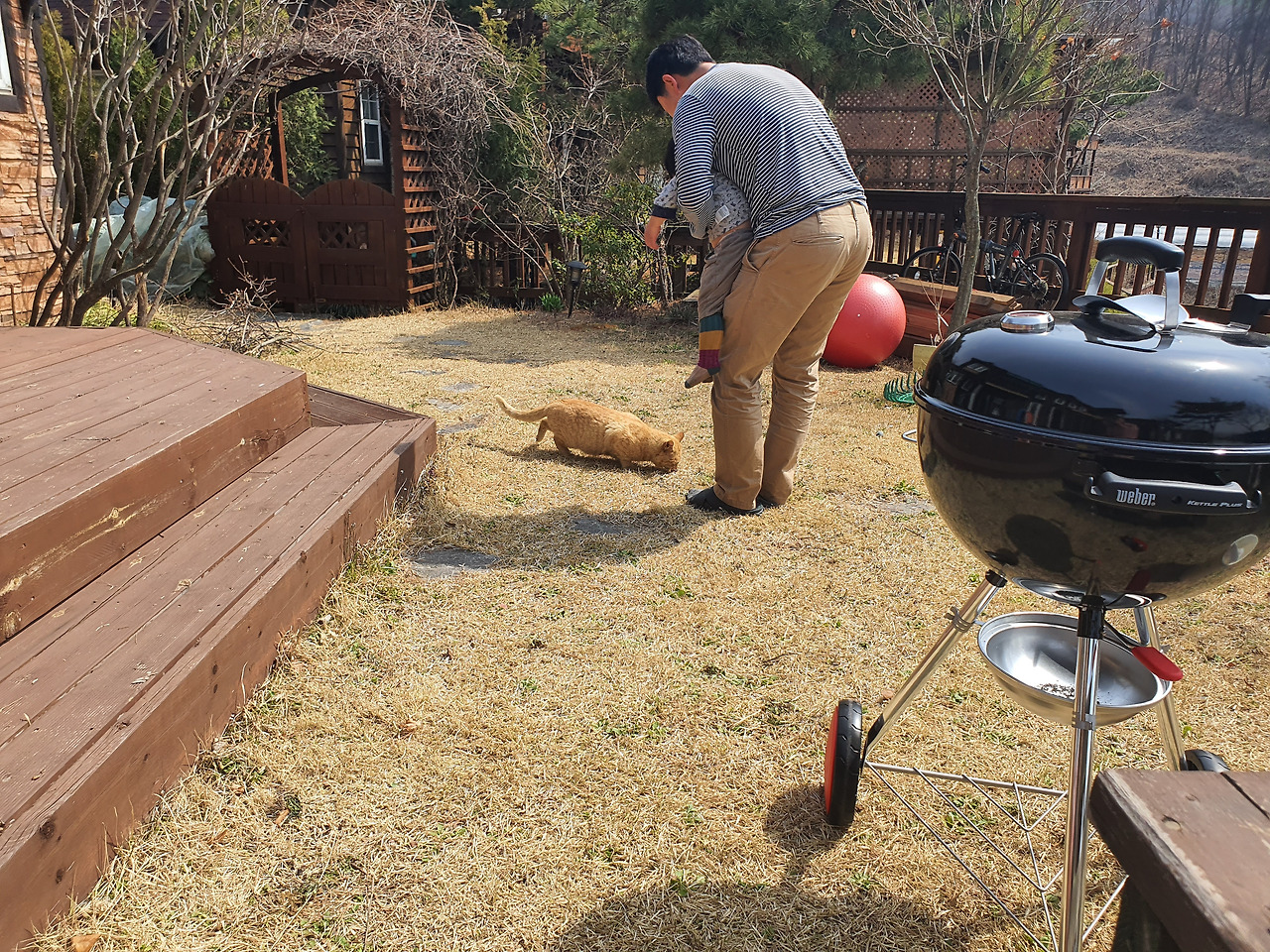 그리고 고기를 구울 때면 항상 찾아오는 손님들도 있습니다. 평소에는 겁이 많아 조심스러운 고양이들인데, 고기 냄새가 나면 대범하게 다가옵니다. 고양이들이 하도 많다 보니 말을 아직 못하는 둘째도 고양이 소리는 고양이와 거의 비슷하게 냅니다.
