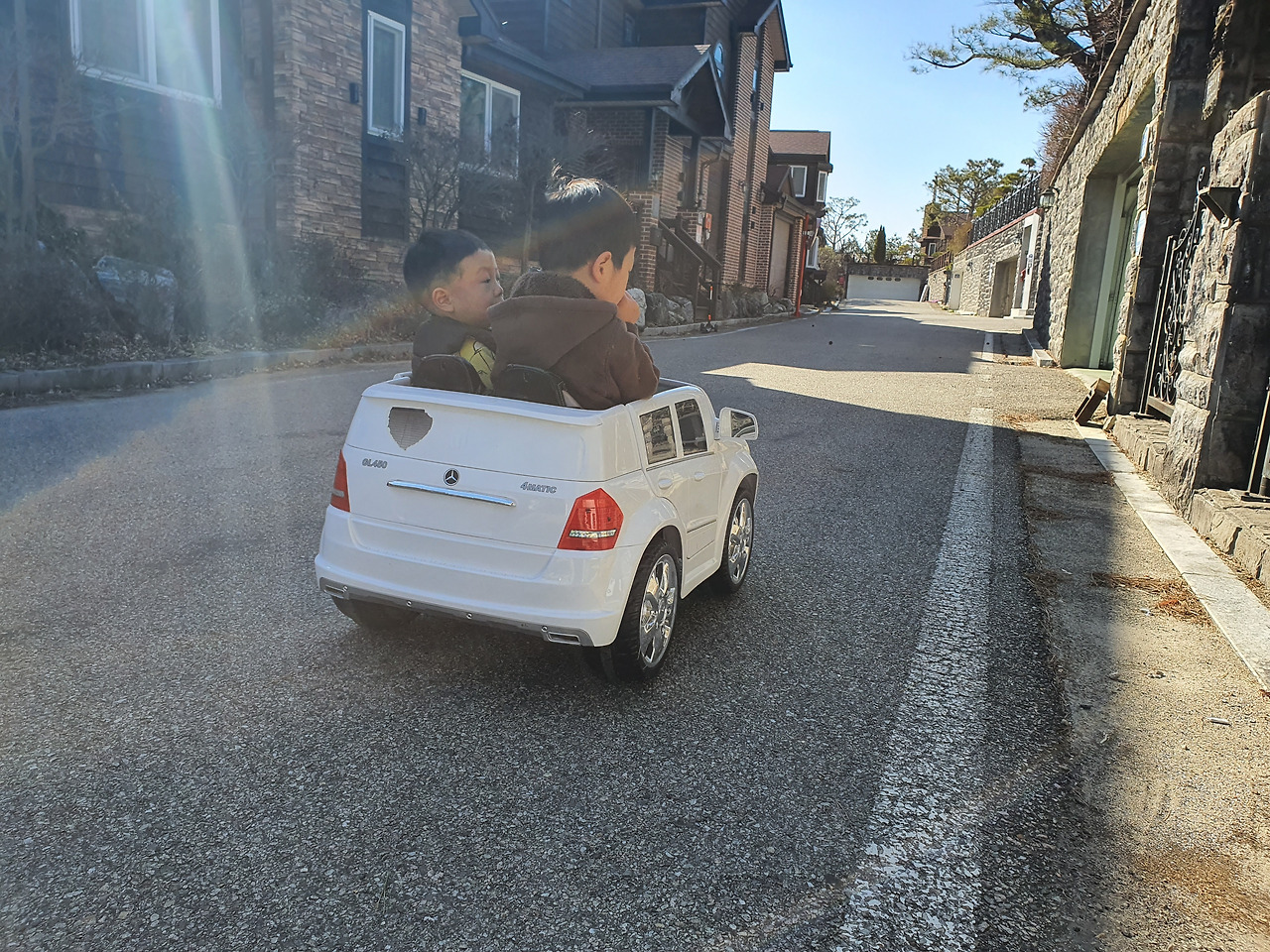 가끔은 드라이빙도 나가는 형제입니다. 단, 차의 성능이 두 아들을 감당할 수준이 되지 못해 엄마의 노력이 많이 필요한 드라이빙이지만, 차에 앉아 있는 것만으로도 즐거워합니다. 집 앞 도로를 달릴 때도 있고, 집 앞 데크에서 왔다 갔다 하는 것도 충분히 즐거워합니다. 한 명만 타면 충분히 재밌는 드라이빙이 가능할 텐데 한 명이 타면 꼭 다른 한 명이 본인도 타겠다고 하여, 무거운 드라이빙을 하게 됩니다.
