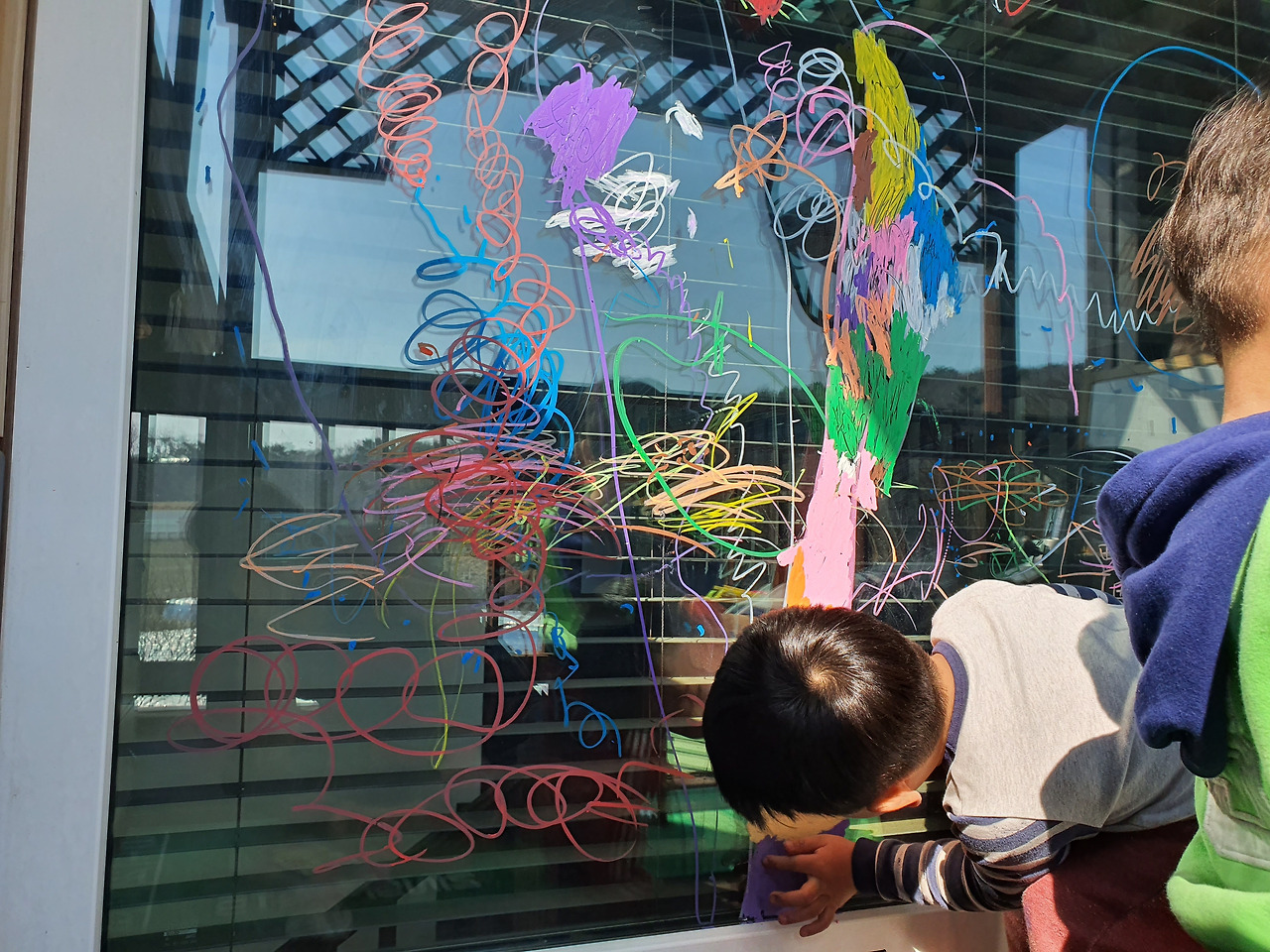그 외에도 창이 많은 우리 집의 장점을 충분히 이용할 수 있게 '글라스 펜'을 이용한 미술활동도 합니다. 안에서도 충분히 재밌는 놀이를 할 수 있지만 밖에서 하니 더욱 활기찬 작품이 나오는 것 같습니다.