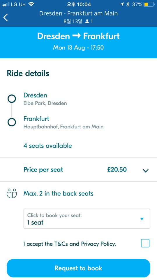 버스나 기차에 비해 몇 유로씩 (때론 많이!) 저렴해 경비 절약에다가, 보통 버스보다 소요 시간이 짧아서 피로도도 덜합니다. 내 루트와 시간이 맞는 선택지가 있다면 운전자에게 탑승 요청을 보냅니다. (자동 승낙도 있고, 운전자가 보고 승낙해주는 경우도 있습니다.)