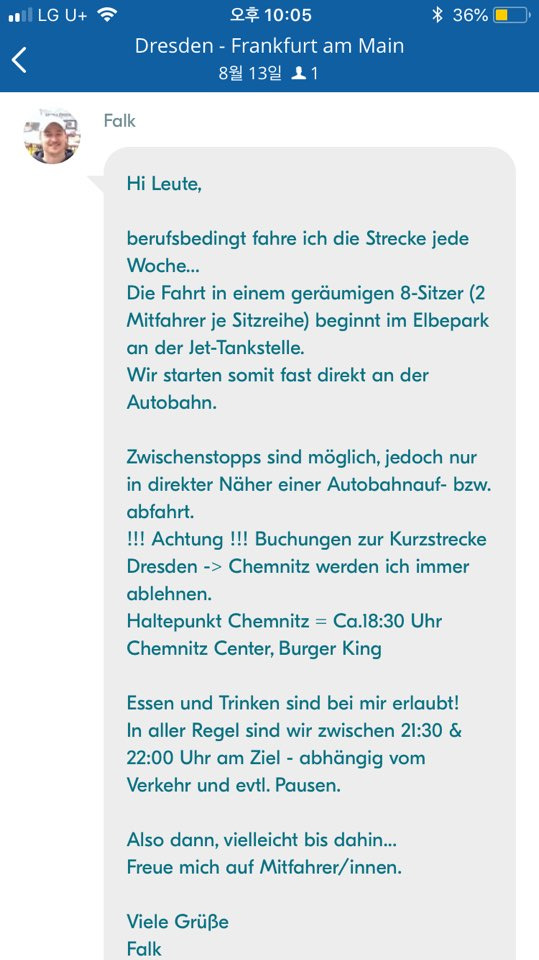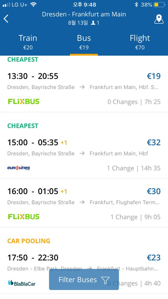 그 외에는 보통이라면 1안을 선택할지도 모르지만, 당신이 그 날 낮에 드레스덴 시내를 좀 더 구경하고 싶다면.. 낮 1시에 출발해 7시간 반이나 걸리는 플릭스버스(1안)보다, 3시간이나 적게 걸리고 5시 50분에 출발하는 블라블라카(4안)를 선택해도 괜찮을 것 같습니다.