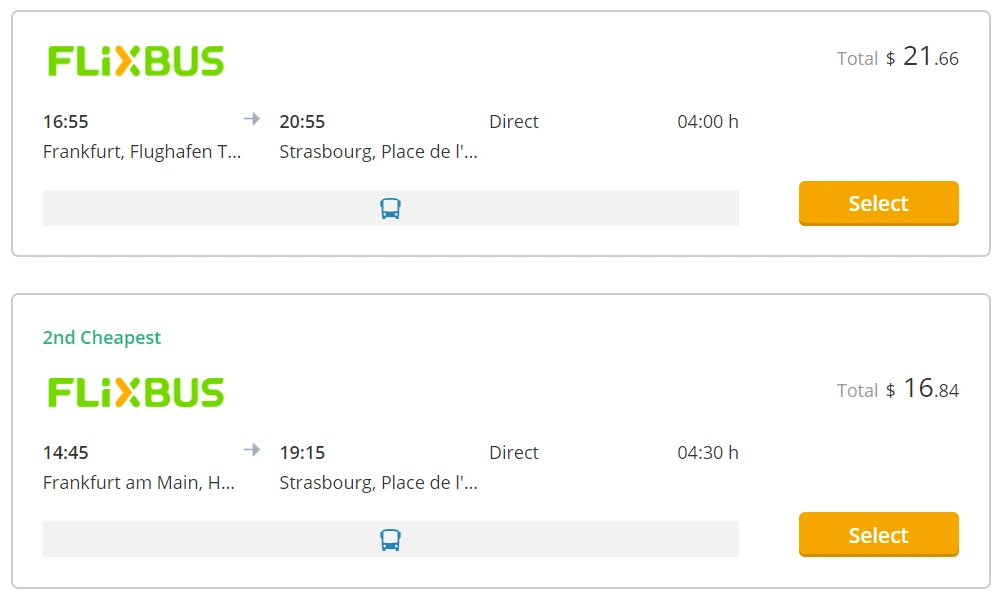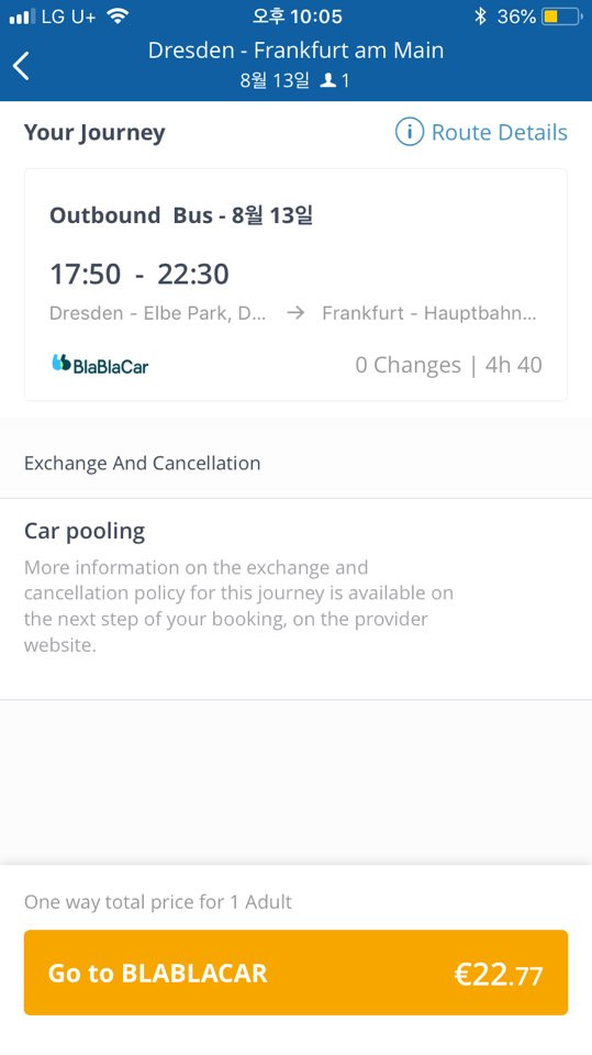 (A 7:50분 출발, 20€) (B 7:55분 출발, 22€)입니다. 그러면 응? A가 더 싸네? 똑같은 노선인데!하고 A를 선택합니다. 알고 보니, A는 공항 출발, B는 시내 출발. 똑같이 Frankfurt라고 적혀 있는 것 같지만 상세 정보를 보니 출발점이 다릅니다. 이 둘은 같은 버스입니다. 이걸 모르고 A를 선택하면 머나먼 공항으로 가야할 수 있다는 점! 항상 예약 전 출발 지점이 어딘지, 확인을 꼭 꼭 해야한다는 점!