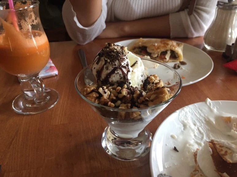 <한끼줍쇼>의 강호동, 이경규를 기다리던 승리가 있던 곳이 바로 아르바트 거리에요. 블린! 기억나시나요? TV를 안 보신 분들을 위해 블린은 러시아의 팬케이크에요. 밀가루 반죽 안에 꿀, 초콜릿, 바나나, 생크림 등을 넣어 먹을 수 있어요. 달콤하고 맛있답니다. 저는 개인적으로 생크림 팬케이크보다도, 버섯, 토마토, 치즈 등이 들어간 팬케이크류를 추천해요. 한끼 식사로 정말 딱이에요. 다른 디저트류도 많은데, 고소한 견과류가 들어간 아이스크림도 참 맛있어요.