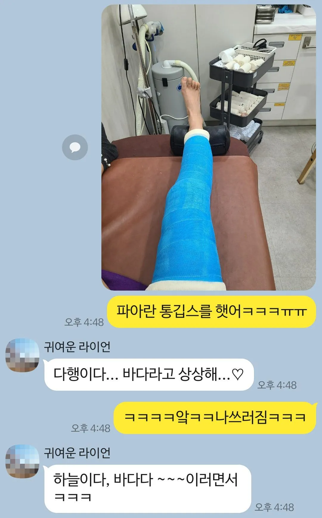 "파아란 통깁스를 했어 ㅠㅠ"