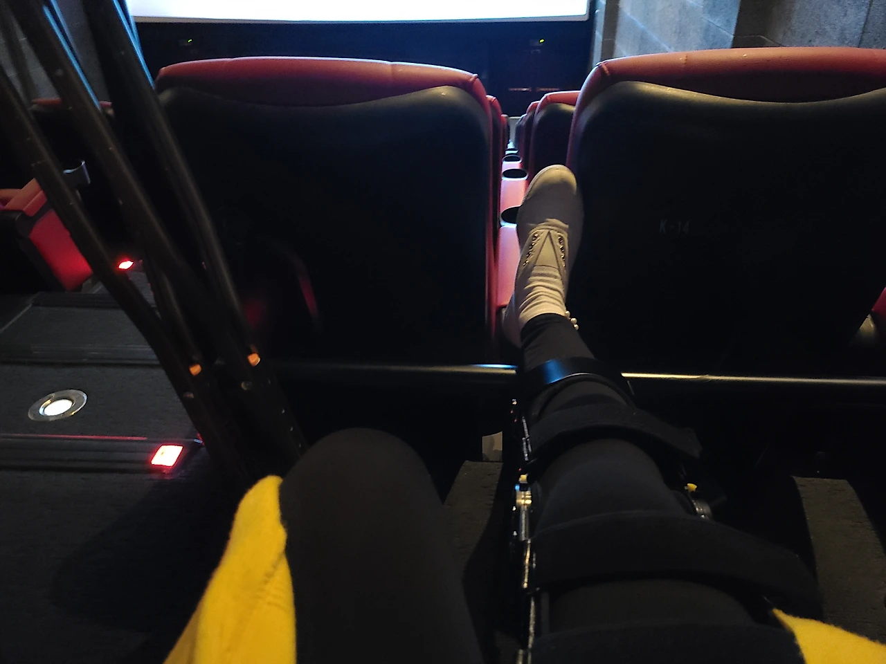 설레는 마음으로 들어간 영화관 자리에 또 한 번 감동했다. 그냥 봉이면 다리를 올리지 못했을 텐데, 낮은 층에 봉이 하나 더 있는 2단 봉이였다. 거기에 다리를 올리는 각도가 딱이었다. 푹신한 발 받침대는 아니었지만 그래도 내 다친 다리를 올릴 수가 있는 거였다. 감사하고 또 감사했다.