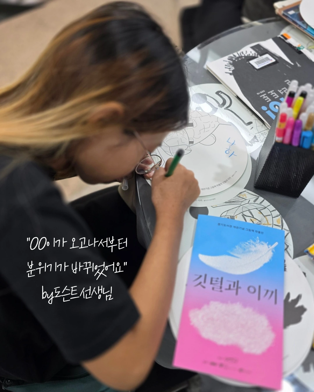 주제는 환경을 다룬 그림책 이야기였다. 설명이 흥미로워서 시간 가는 줄 모르고 빠져들었다. 도슨트가 끝나자, 그림책 속 장면을 직접 색칠해 보는 컬러링 활동이 이어졌다. 아이는 집중해서 색을 칠했고, 그 즐거움이 전염된 듯 다른 아이들도 하나둘 모여들었다.