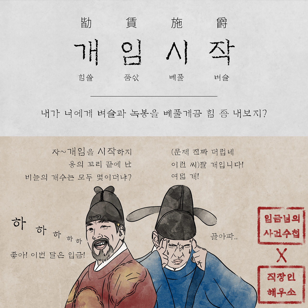 저는 슈퍼갑질러 임금과 15년 취준으로 장원급제한 신입사관에 초점을 맞춰