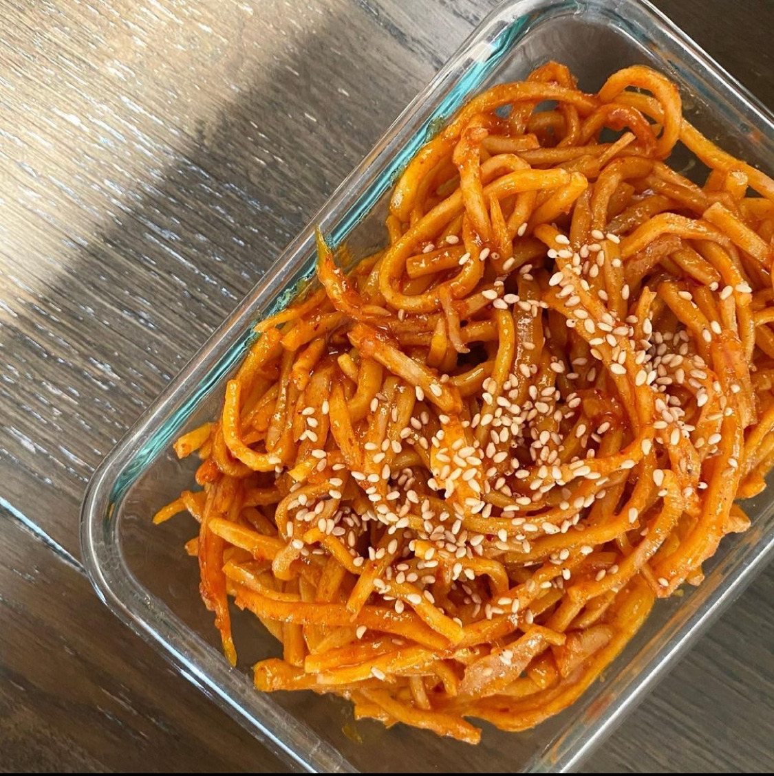재료: 오징어채 100g, 고추장 1.5 숟갈, 간장 1 숟갈, 올리고당 2 숟갈, 매실액 1 숟갈, 마요네즈 2스푼, 고춧가루 1 숟갈, 다진 마늘 1 숟갈, 참기름 쪼르륵, 참깨 1 숟갈,
