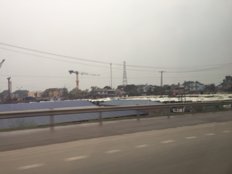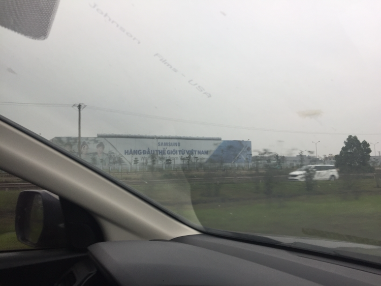 버스의 지붕만 보이는데 이 많은 버스들이 다 삼성전자 버스다. 근로자들을 출퇴근시키는 버스다. 근로자들은 각자의 집에서 오토바이를 타고 이곳까지 와서 이 버스를 타고 삼성전자 휴대폰 공장으로 출퇴근을 한다. 이곳은 고속도로 입구로서 버스를 타면 고속도로를 달려 15분 정도면 닿지 않을까 싶다.