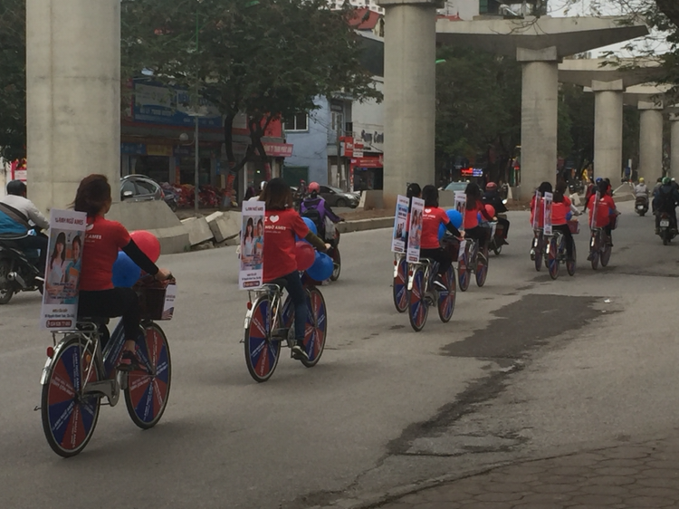 하노이 동서를 잇는 지상철 공사가 진행되고 있다. 그 밑 도로를 달리는 소녀들의 자전거 행렬... 자전거 모양도 독특하고 등에 진 판넬의 사진도 누구 사진인지 궁금하다.