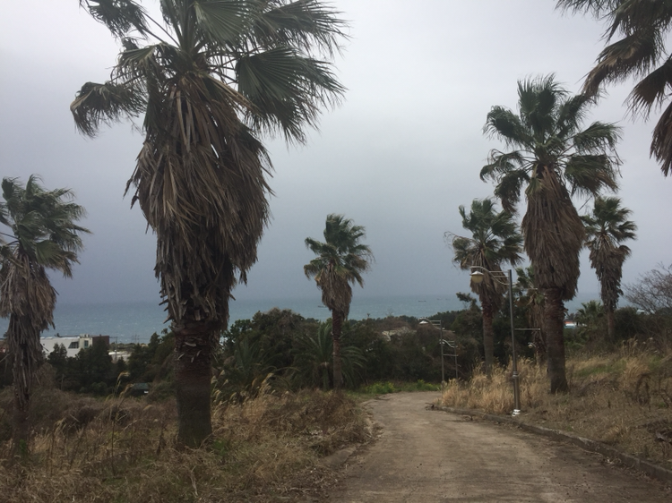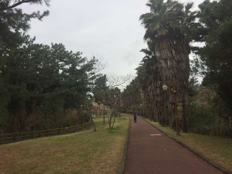 천지연폭포 가는 방향에 야자수가 줄지어 서 있다