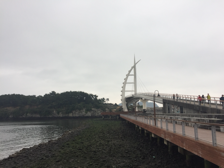 다리를 건너 새섬으로 넘어는 중이다. 새카만 돌이 용암 분출을 증거한다.