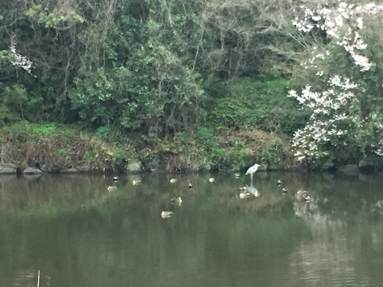 서홍천에 오리떼와 다리가 긴 새가 어울려 있다