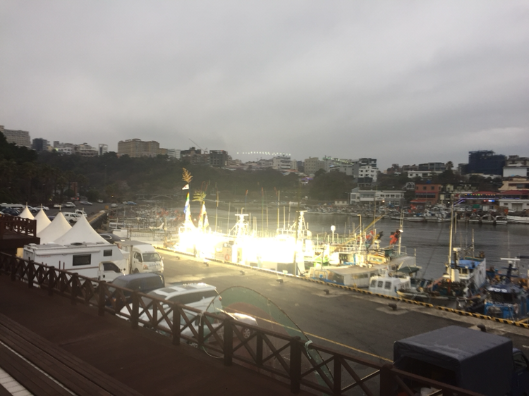 서귀포항에 정박된 어떤 배에 불이 요란하게 켜져 있다. 출어 준비중인가보다