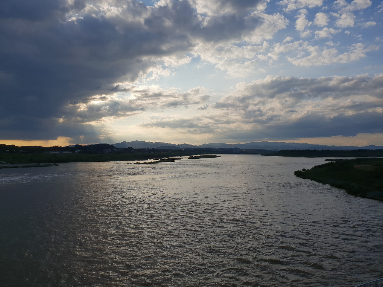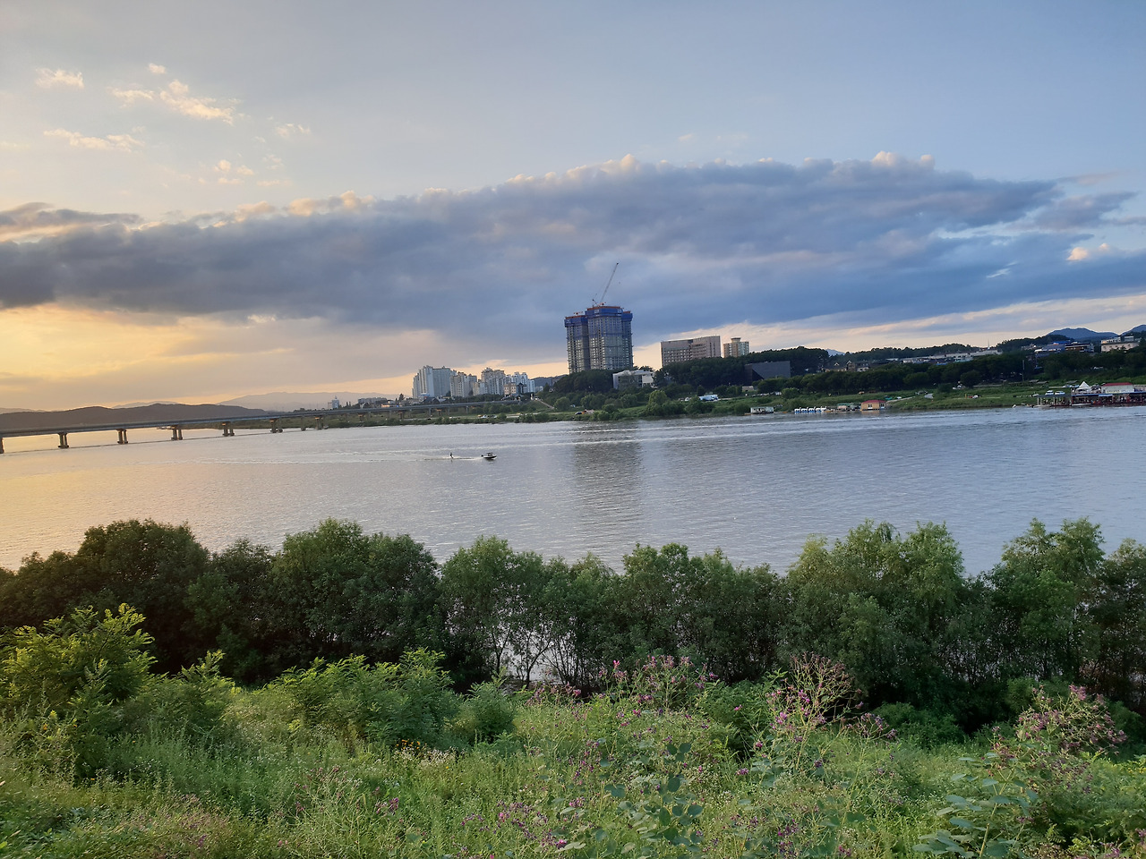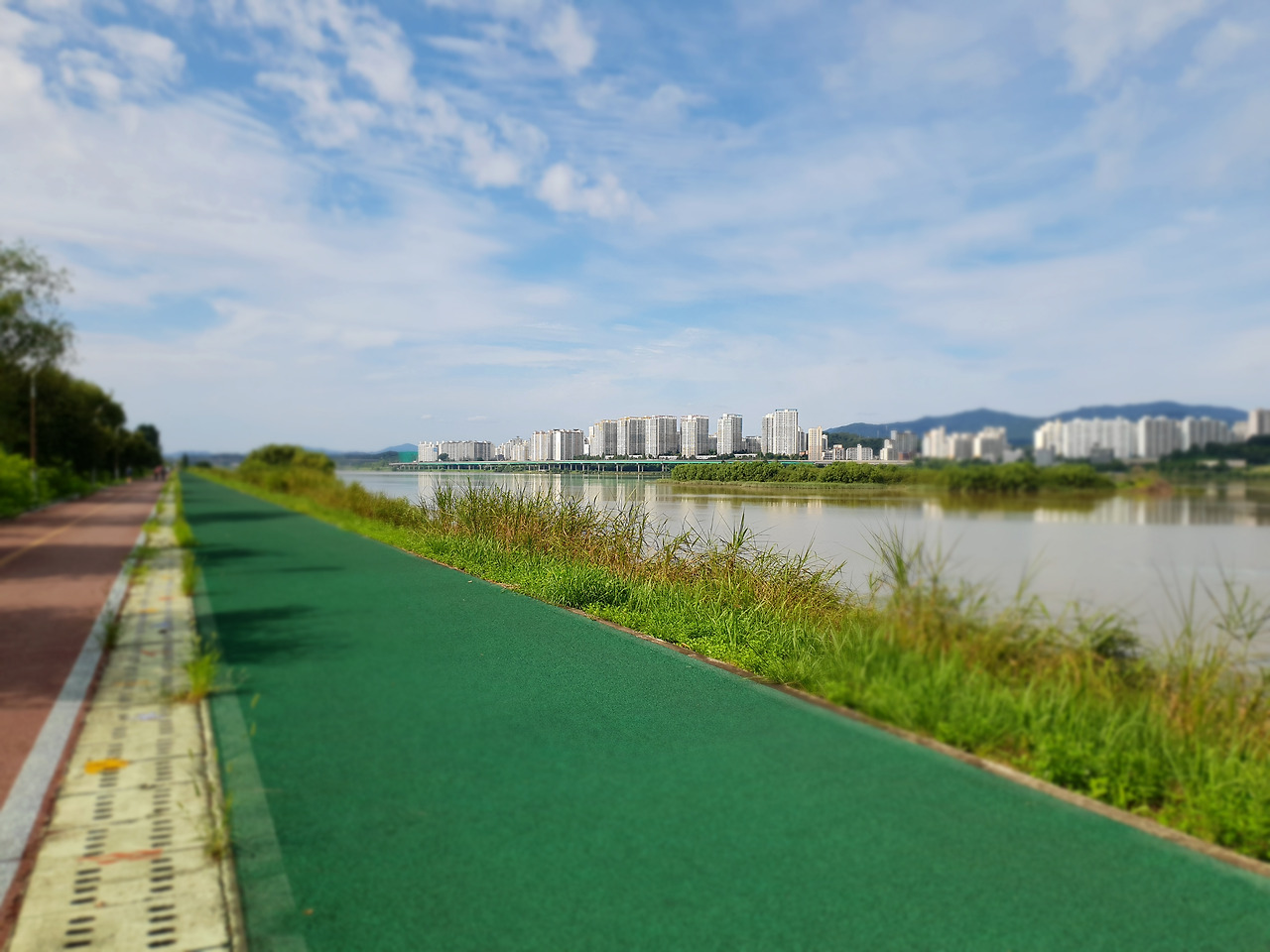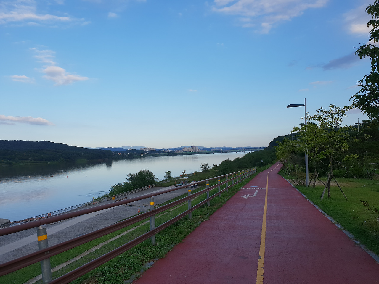 한강자전거길이 미사리를 지날 때 상행과 하행의 길이 다르다. 서울쪽 길은 한강쪽 낮은 지대에 있고 팔당쪽 길은 높은 곳에 있다. 서울로 향하는 중이니 한강쪽 낮은 길을 달렸다. 건너편 덕소의 아파트촌이 한강과 잘 어울려 있었다. 강물 위로 아파트의 그림자가 비쳤다. 하늘을 보니 가을이 왔음을 느낄 수 있었다.