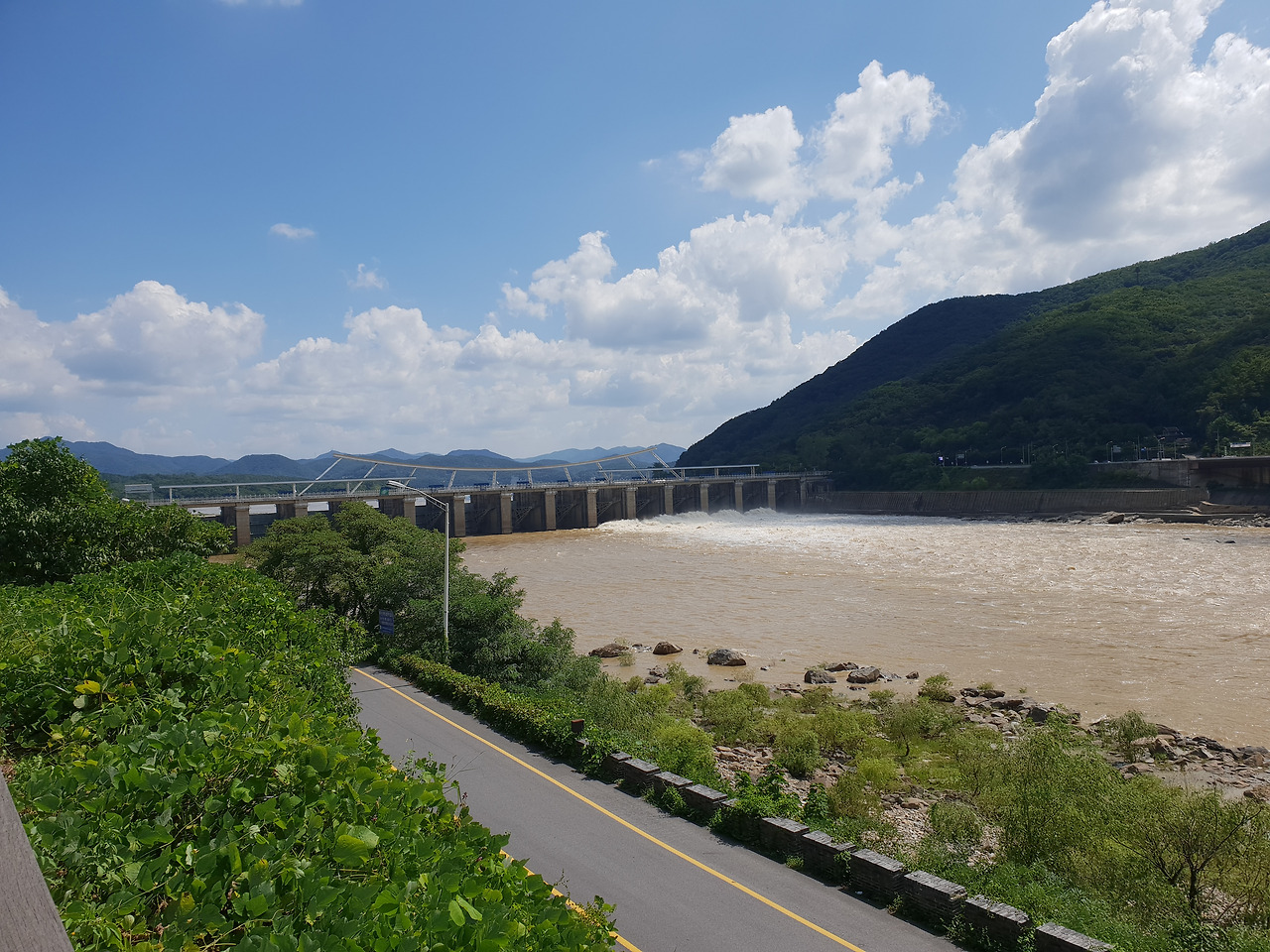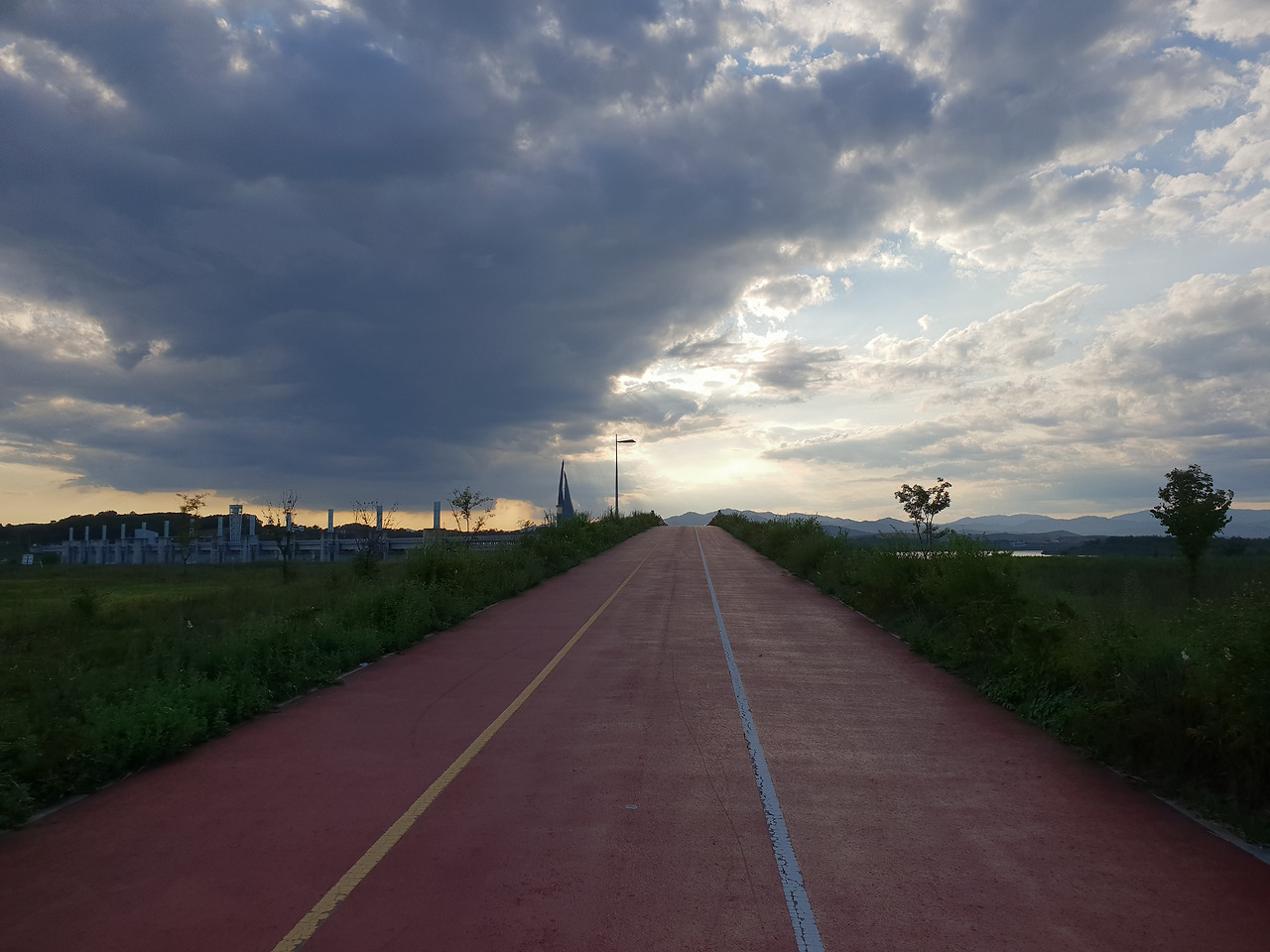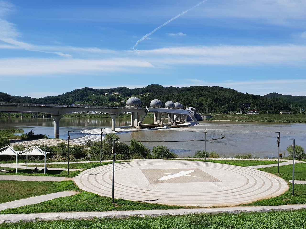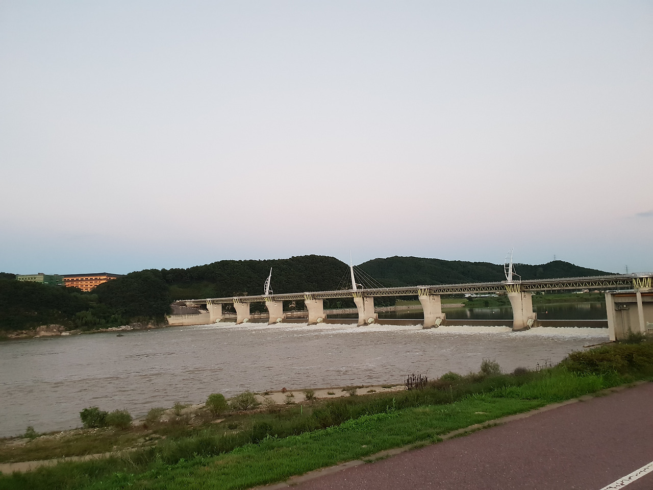 여주보가 아득히 멀리 보이기 시작했다. 여주보 너머로는 또 여주 시내의 모습도 아스라히 보인다. 마을을 하나 통과했다. 남한강자전거길의 길바닥은 갑자기 붉은색으로 바뀌었다. 여주보 입구에서 길이 한번 크게 휘었다.