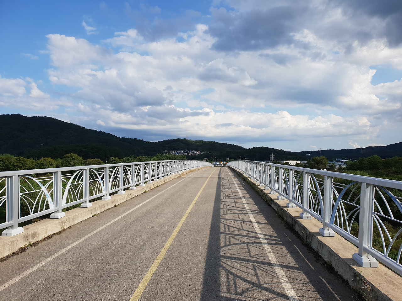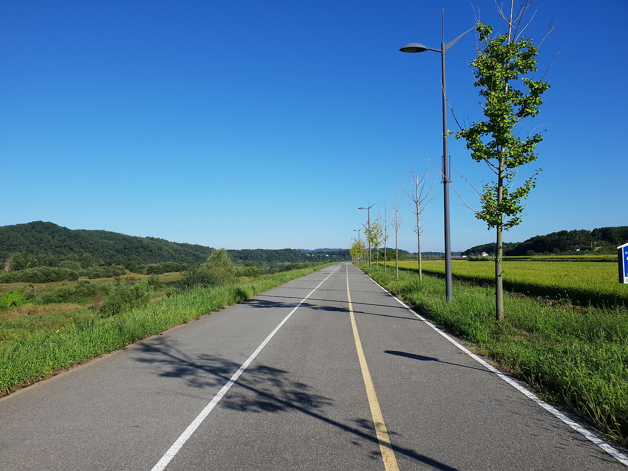 전날 왔던 길 그대로 돌아갈 생각이었으나 강쪽으로 또다른 자전거길이 나 있는 것을 보고 마음이 바뀌었다. 그 길로 가보고 싶었다. 인적이 더욱 드문 강쪽 길은 사람들의 통행이 거의 없어 보였다. 이렇게 조용한 곳에 포장된 도로를 왜 만들어 두었을까 싶을 정도였다. 길은 강천보가 가까워졌을 때야 비로서 끝이 났다. 넓은 길과 만났다.