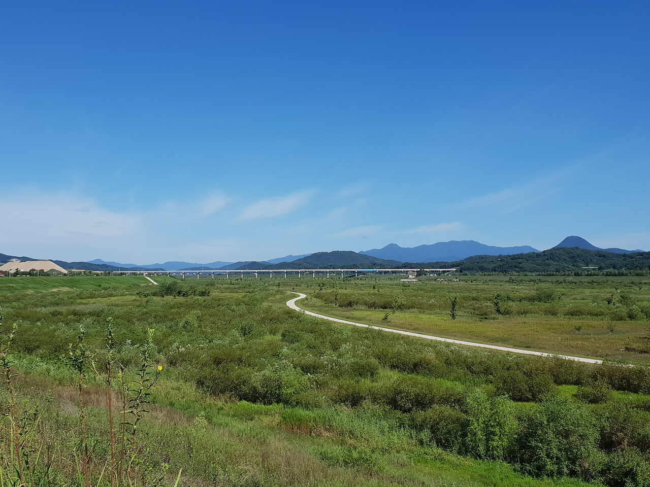 이포보오토캠핑장을 지나면 참으로 길고 지루한 평지가 계속된다. 머리 위론 광주원주(제2영동)고속도로가 지나간다. 한참을 달리다 보면 비행기 활주로 같은 구역도 지난다. 약간 내리막이었다가 끝에 가서는 오르막이므로 비행기가 내리고 뜰 순 없다. 아주 작은 비행기라면 모르겠지만... 지루한 저류지 부근 일직선 길도 지나고 다시 길이 아기자기해졌다.