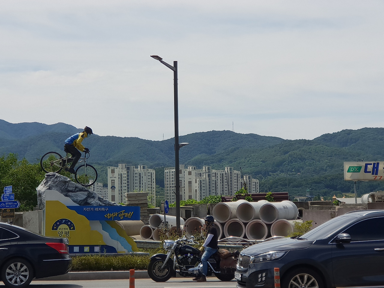 양근리사거리에 이르렀다. 양평은 자전거 타기 천국이라는 사인이 여기저기 붙어 있었다. 가장 극적이었던 건 자전거 타는 사람의 모습이 형상화되어 마치 진짜 사람처럼 걸려 있었던 것이다. 군립미술관 앞을 지나 남한강자전거길에 들어섰다. 오빈과 아신을 지났다. 아신역 부근에 언덕길이 있었지만 처음에만 약간 힘들었을 뿐 금세 오를 수 있었다. 그리고 기곡아트터널과 원복터널을 지났다. 국수역과 신원역도 지나고 양수리에 이르렀다.
