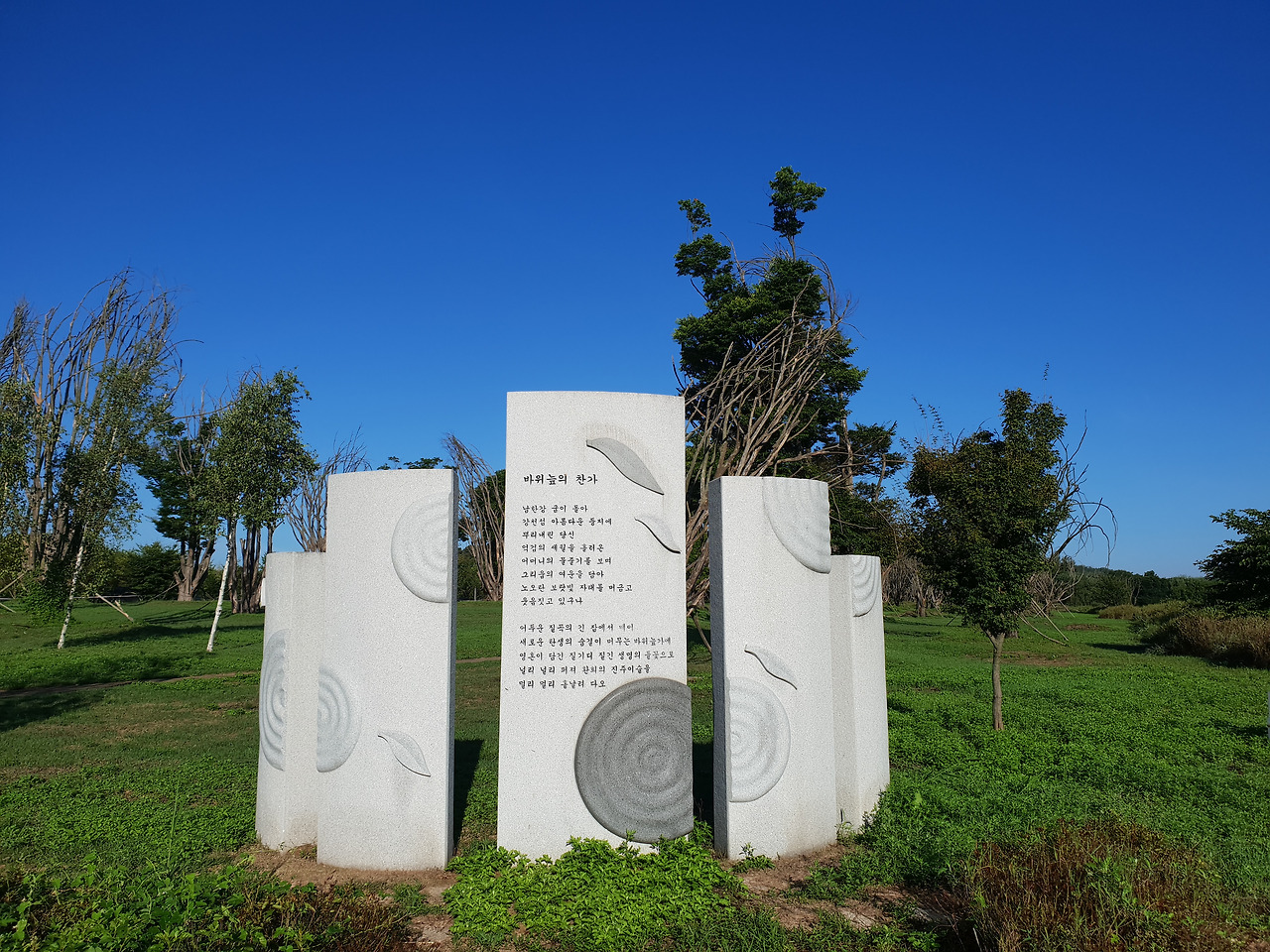 섬을 충분히 돌아봤다 싶었을 때 다리를 건너 강천섬을 나왔다. 섬 입구에 시가 돌에 새겨져 있는 게 인상적이었다. 어제 왔던 길을 그대로 달린다. 전날 저녁에 강천섬 부근에 왔을 땐 어두워서 주변을 잘 볼 수 없었는데 아침에 달리니 여간 길이 깔끔하지 않다. 차나 인적은 거의 볼 수 없다. 도로는 사실상 막혀 있었으므로 차의 통행을 볼 수 없는 건 당연했다. 굴암리쪽으로는 농로를 통해 차가 지날 수 있으려나.