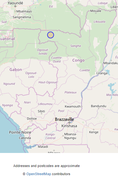 방구에산은 가봉 북동부 지역에 있다. 수도 리브르빌에서 갈 경우 동쪽으로 향해 은졸레(N'djole)와 마코쿠(Makokou)를 지나고 메캄보(Mekambo) 못 미쳐 밤보(Bambo)에서 북쪽으로 조금 떨어진 데 있다. 오고우에이뱅도(Ogooué-Ivindo)주에 속한다.
