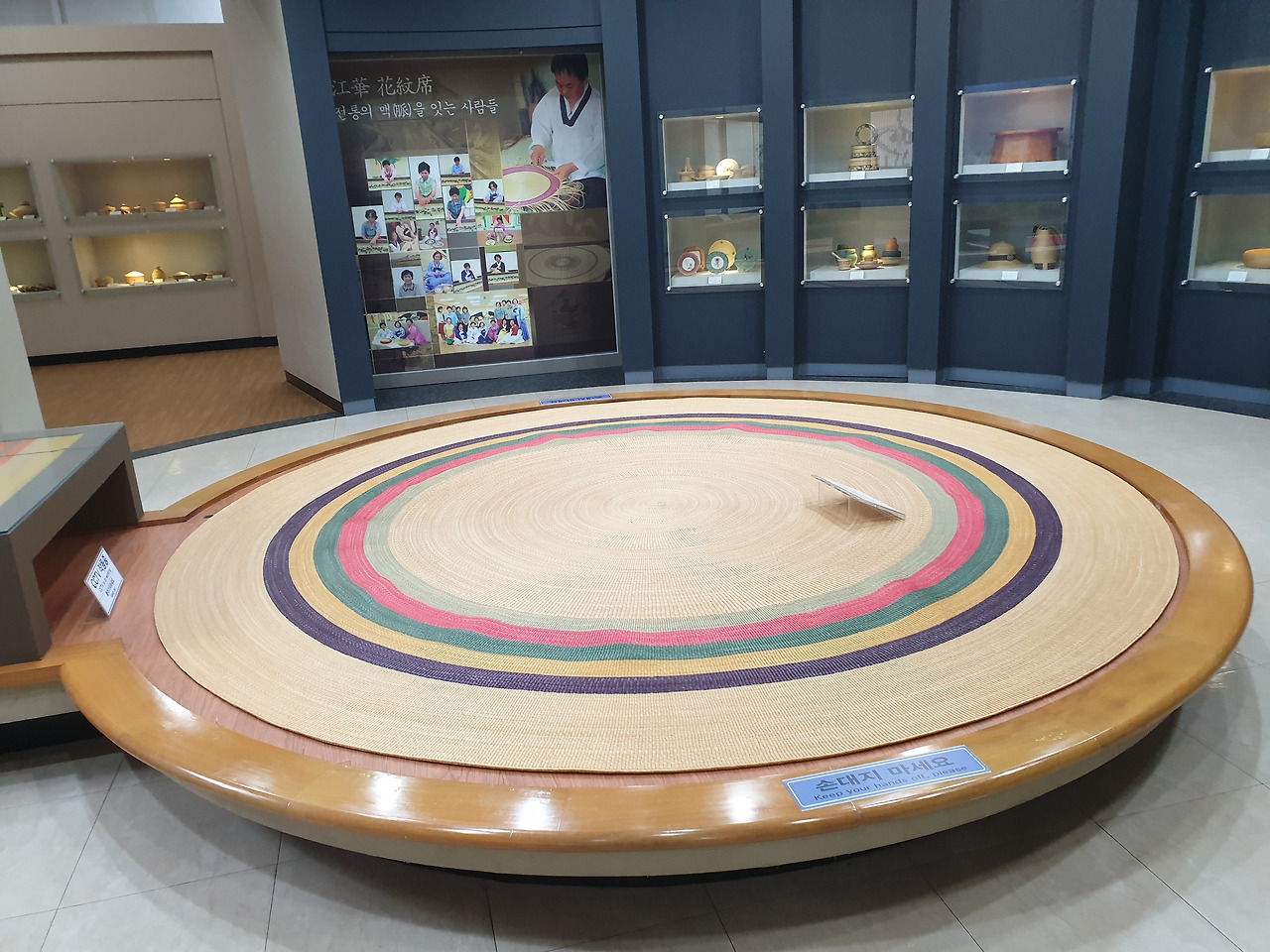 왼쪽으로 가면 평화전망대지만 건너뛴다. 오른쪽으로 향해 화문석체험학습장을 지나 화문석문화관에 들어갔다. 화문석만 전시한 박물관으로 참 관리가 잘 되어 있었다. 문화해설사의 해설도 진지했다. 한 일행이 떠나고 해설사와 단둘이 약 30분간 이야기를 나눴다. 그녀는 아주 해박했다. 고려시대에 화문석을 비롯해 고려 문물을 수입하기 위해 대식국(지금의 사우디아라비아)에서도 이곳까지 왔다 하니 당시 고려는 얼마나 번성했던가.
