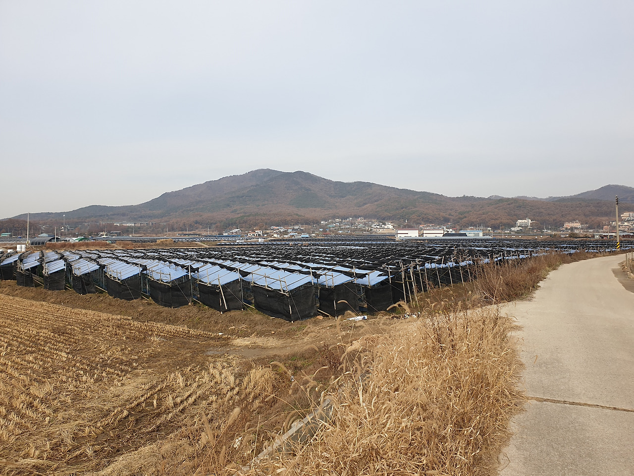 온수리 시내를 지나 길정저수지쪽으로 향했다. 강화영상미디어고 앞 고개를 넘으니 벌판이었다. 저수지는 높은 곳에 위치해 있어 갈 수 없었다. 야콘냉면 앞을 지나 벌판으로 나왔고 거대한 인삼밭이 펼쳐져 있었다. 석릉, 곤릉 가는 표지가 있었으나 큰길에서 너무 멀어 포기하고 지나쳤다. 고려의 왕릉들이다.